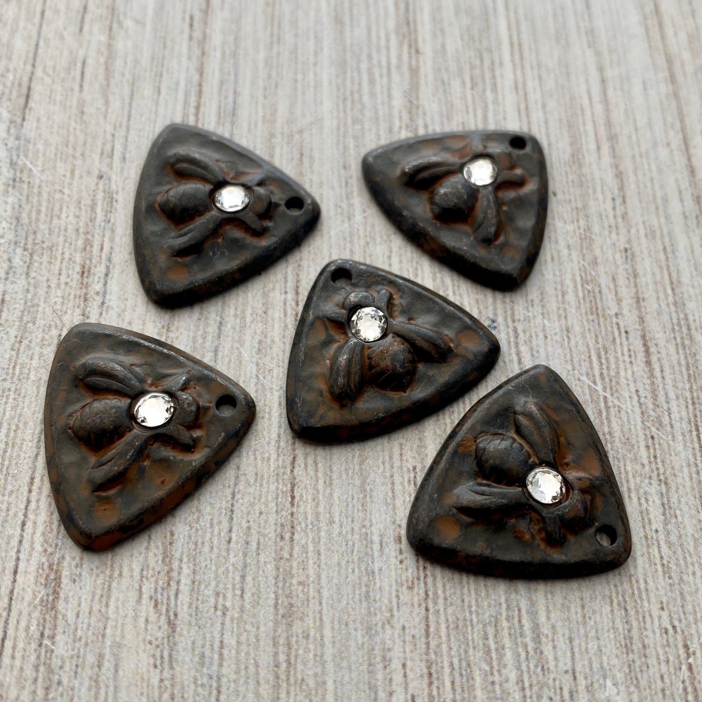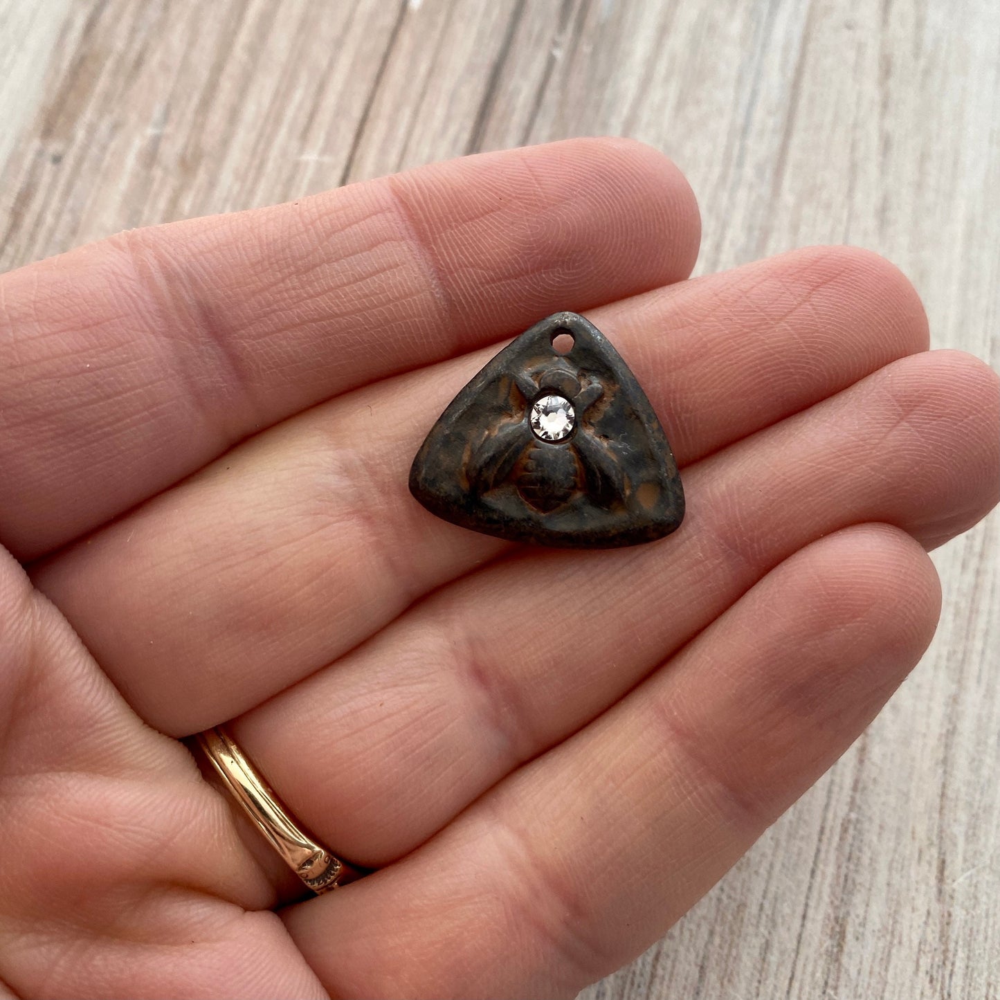 This triangle bee charm with an added touch of Swarvoski sparkle will make your jewelry designs stand out. This is the perfect size and weight for a bracelet, necklace, or earrings.