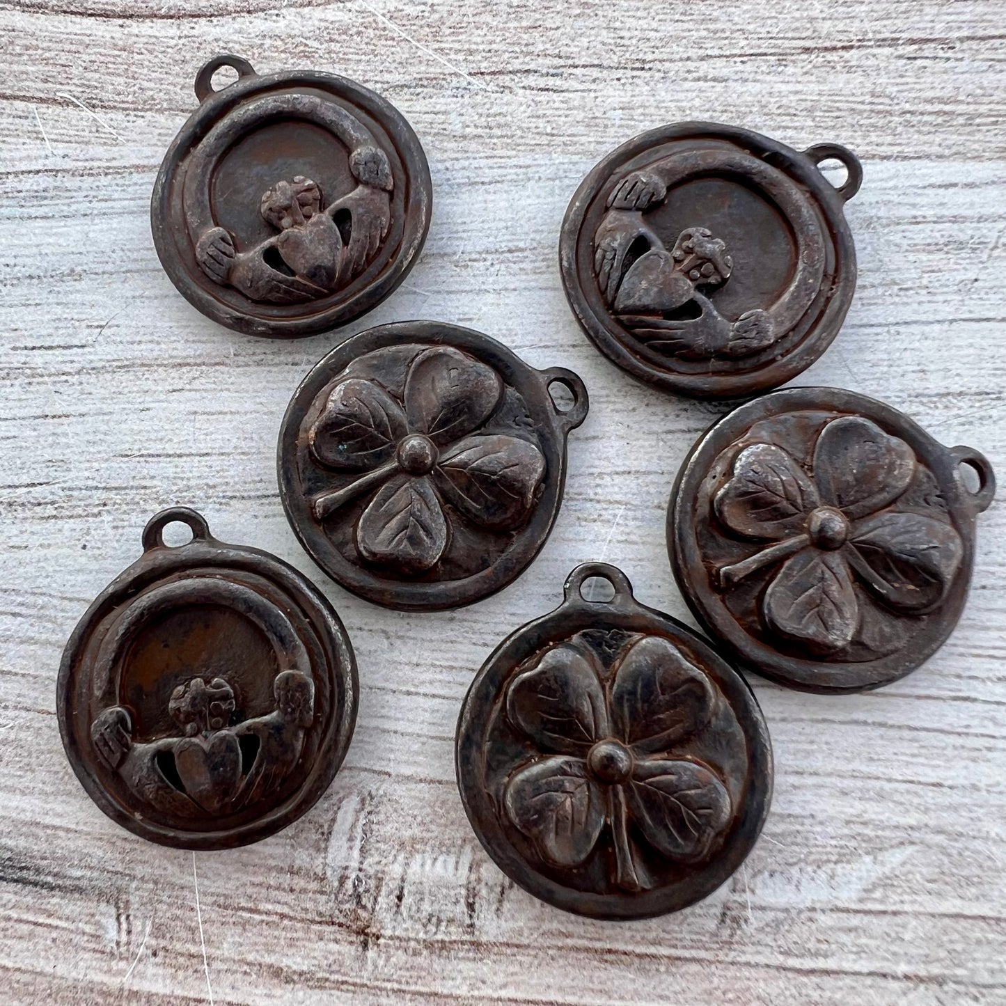Add Soldered Shamrock Pendant, Irish Claddagh Charm, Four Leaf Clover Antiqued Brown, Jewelry Making Supplies, BR-6283 to the cart