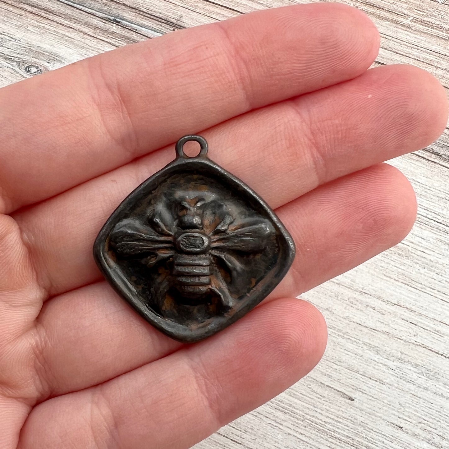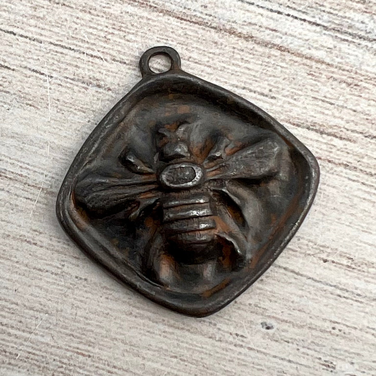 Large Bee Pendant, Rustic Brown Diamond Shaped Bee Charm, Artisan Jewelry Components Supplies, BR-6261