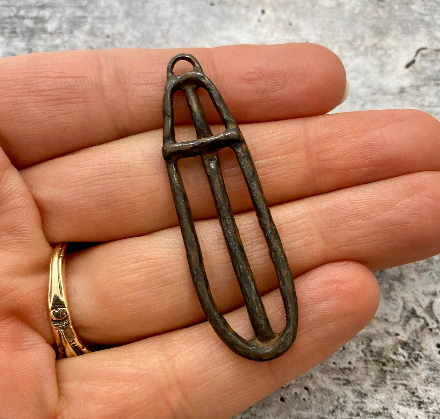 Large Oval Stick Cross Pendant, Long Skinny Artisan Cross, Antiqued Rustic Brown Pendant for Jewelry Making Supplies, BR-6095