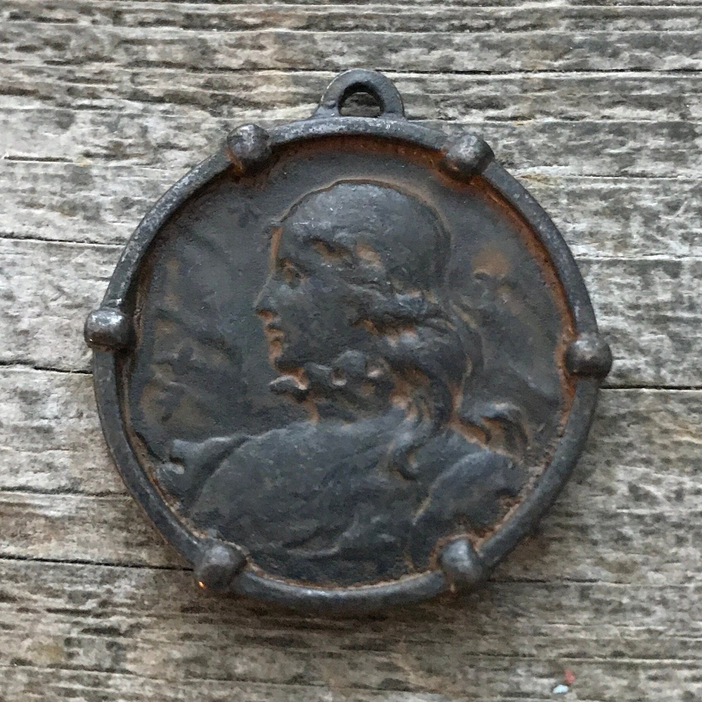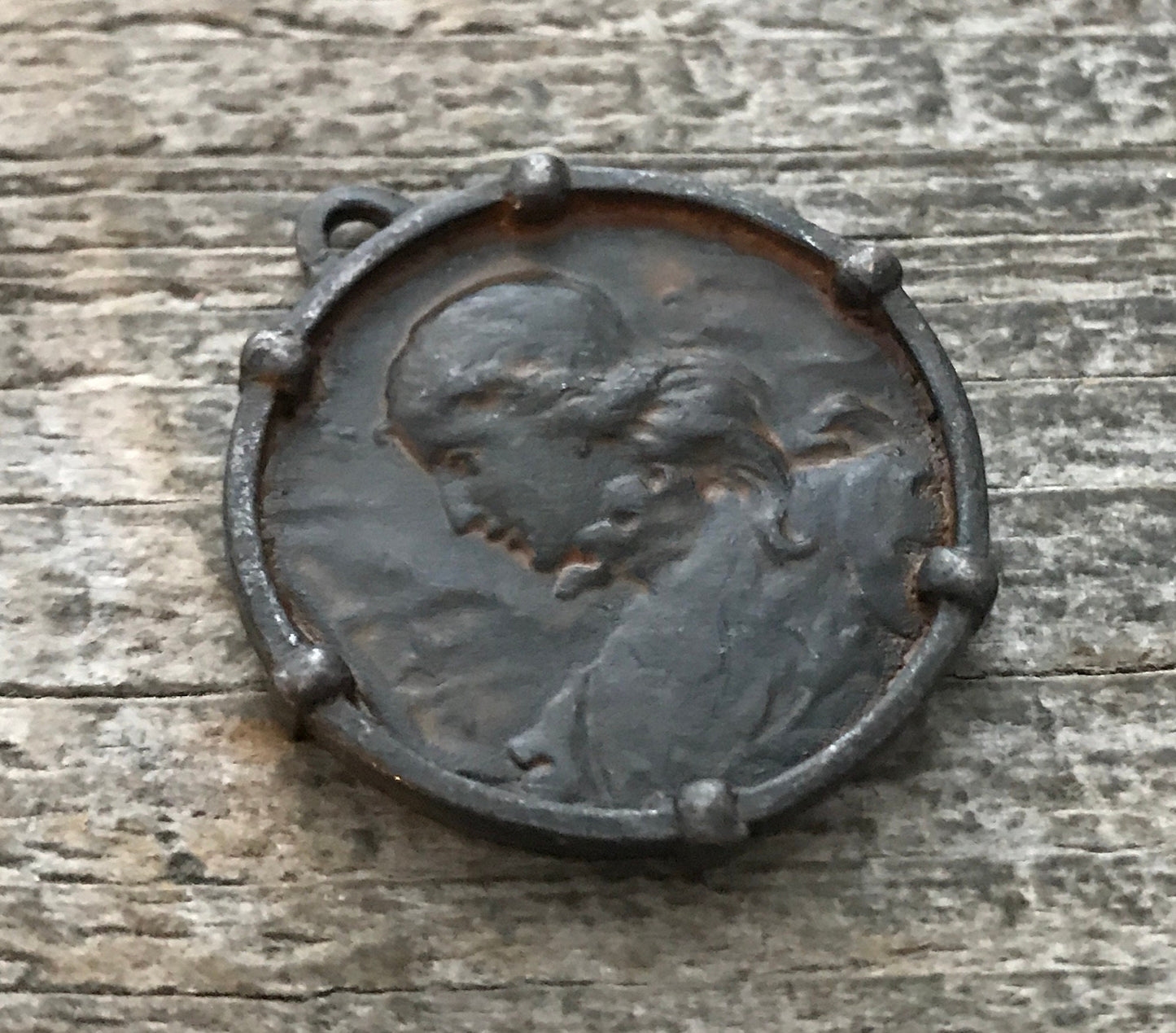 Joan of Arc Medal with Frame, Rustic Brown Charm Pendant, Brave Woman, Saint of Soldiers, Religious Catholic Jewelry Supplies, BR-6124