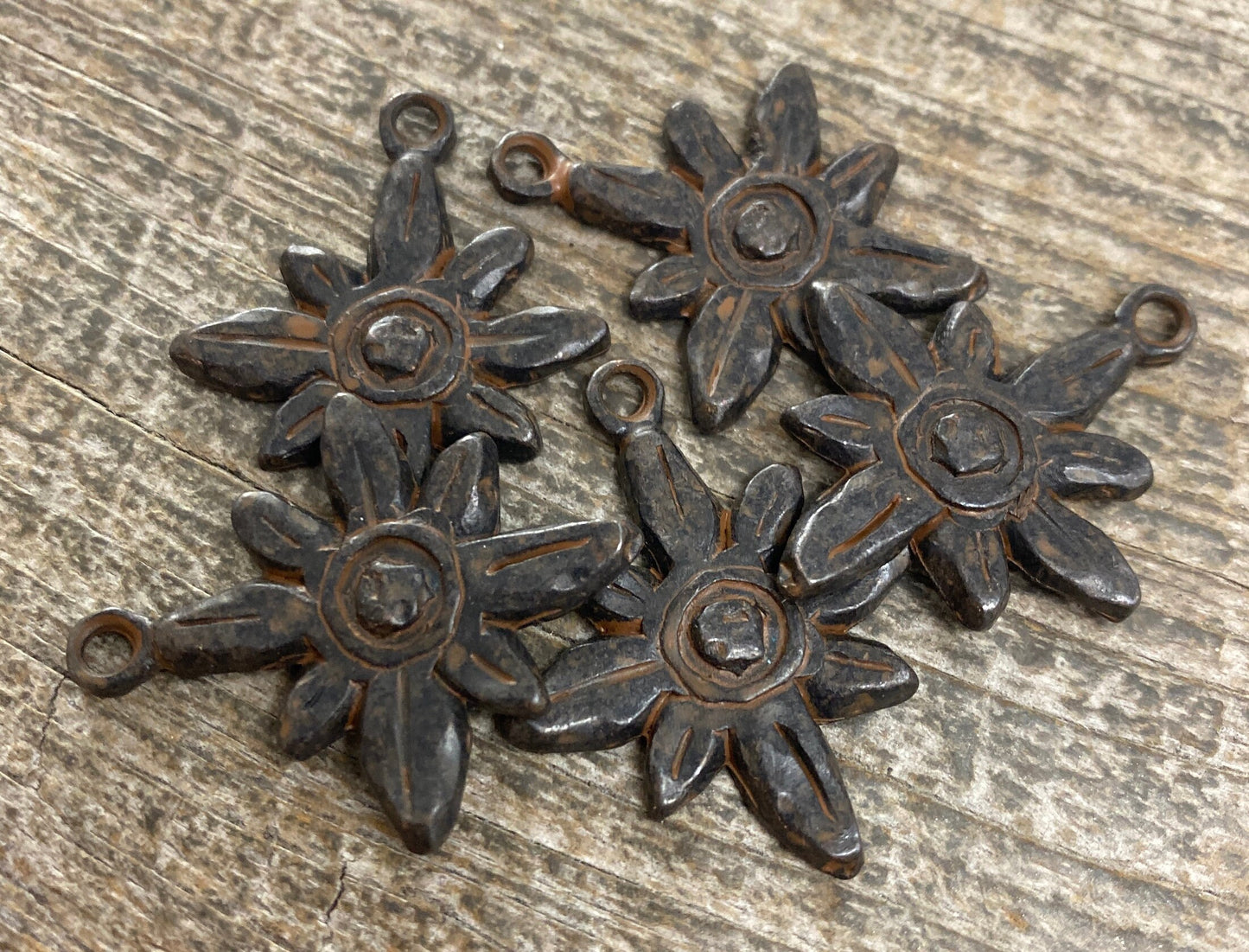 Hammered Flower Charm, Antiqued Rustic Brown Pendant for Jewelry, BR-6086