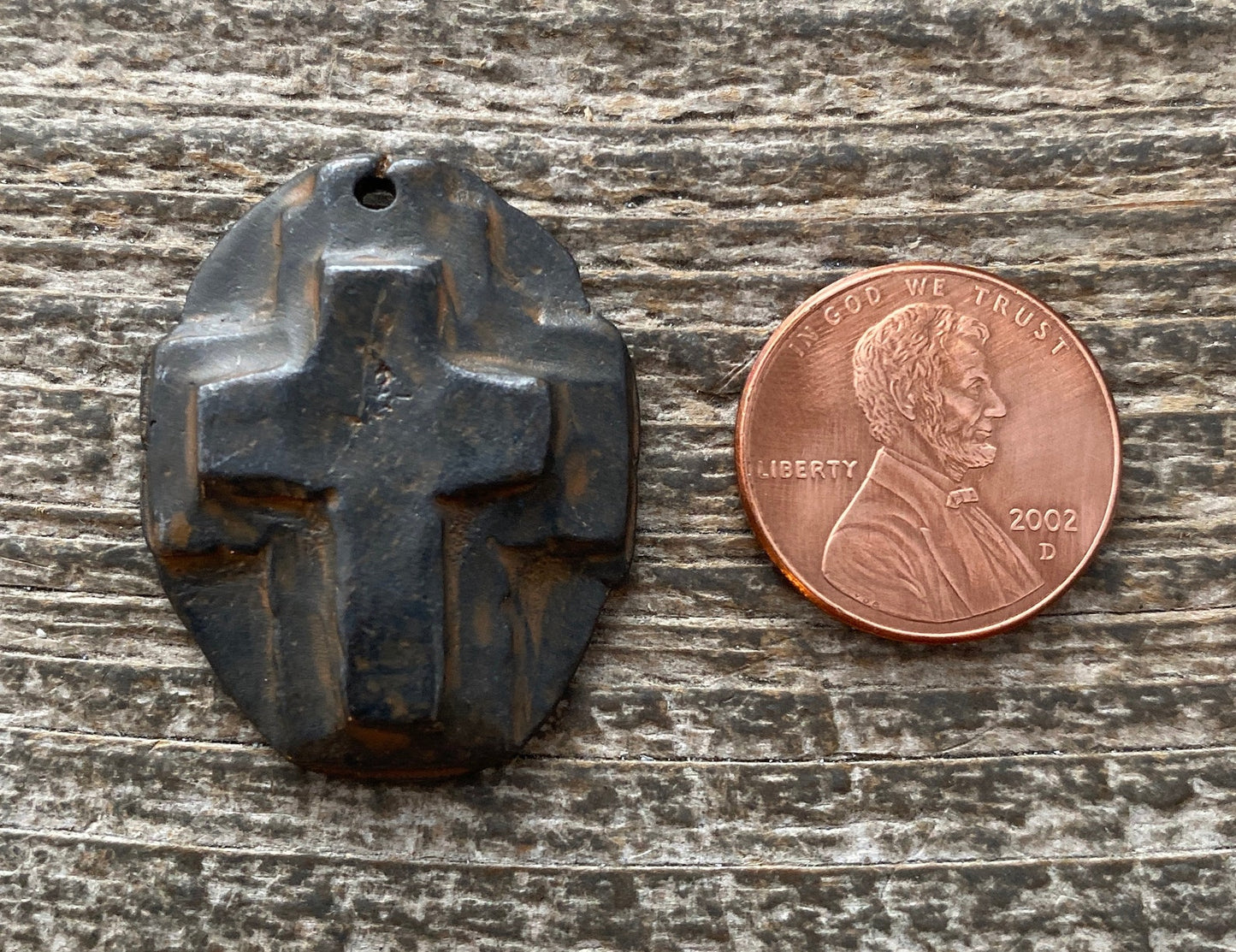 Add Hammered Artisan Oval Cross Pendant, Antiqued Rustic Brown Cross, Leather Pendant, Religious Jewelry, Cross Charm, BR-6080 to the cart