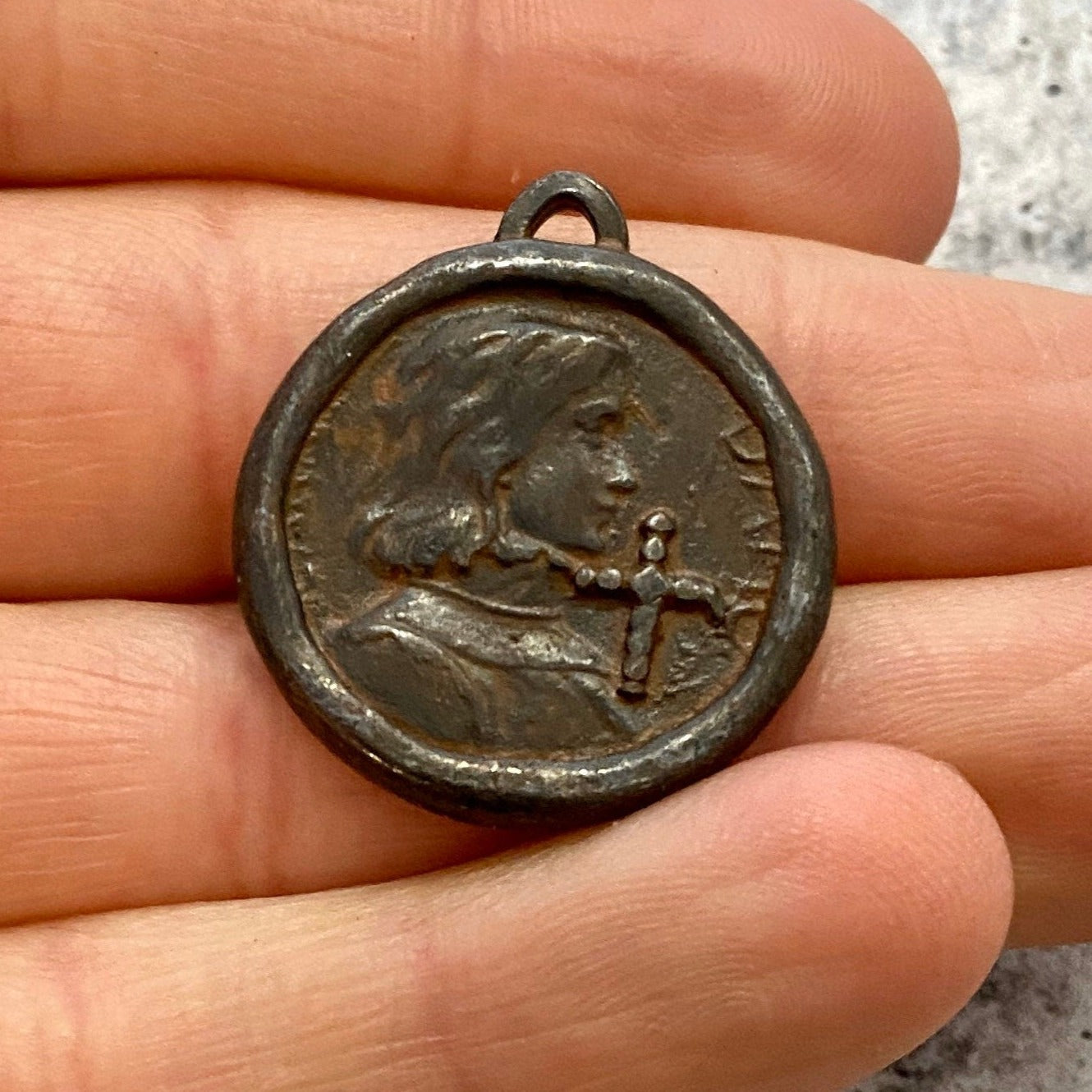 Soldered Joan of Arc Medal, Antiqued Rustic Brown Charm Pendant, Brave Woman, Saint of Soldiers, Religious Catholic Jewelry Supply, BR-6098