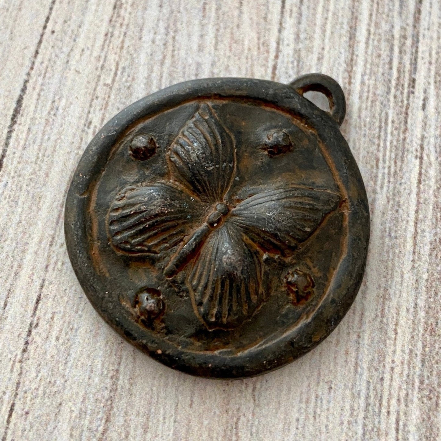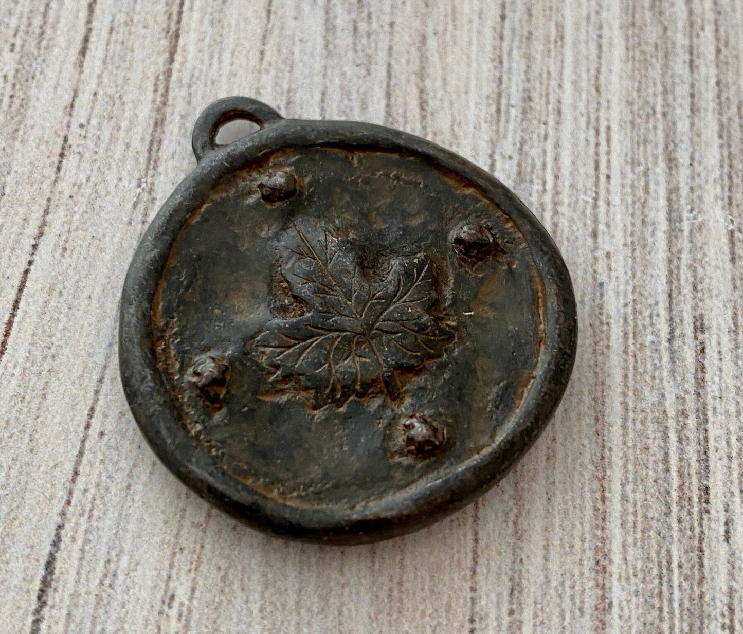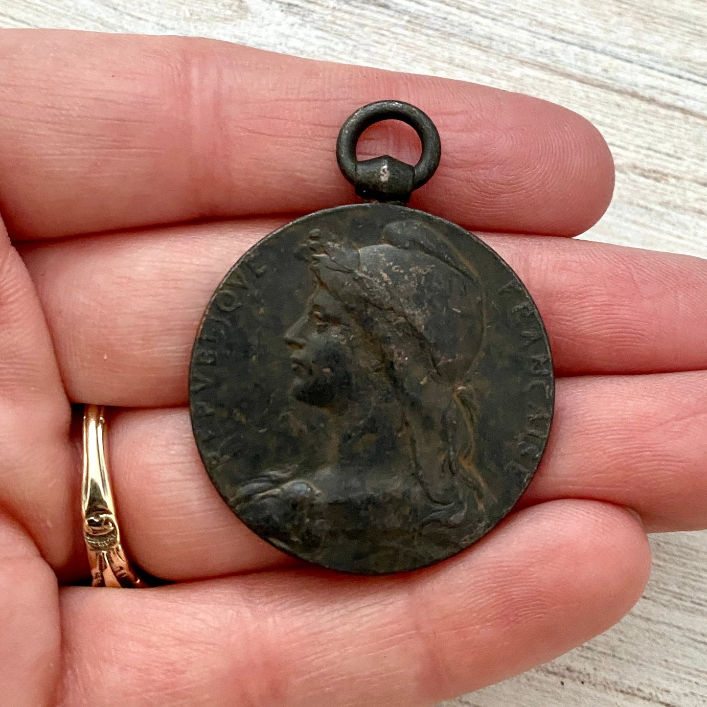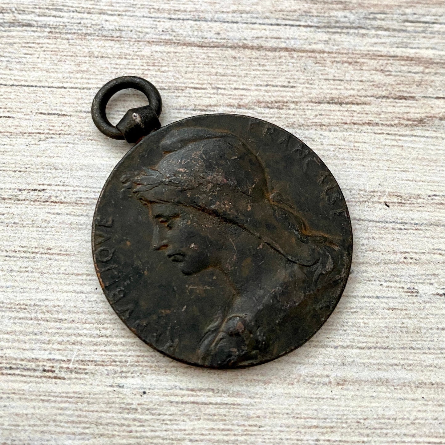 Large Old French Medal Replica, Antiqued Rustic Brown Charm Pendant, Woman Lady Coin, Jewelry Supplies, BR-6134