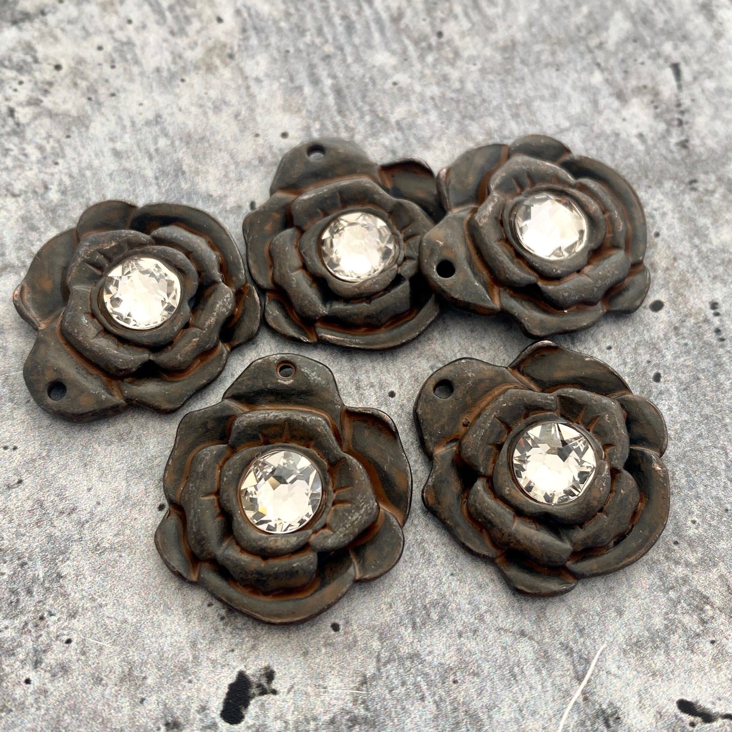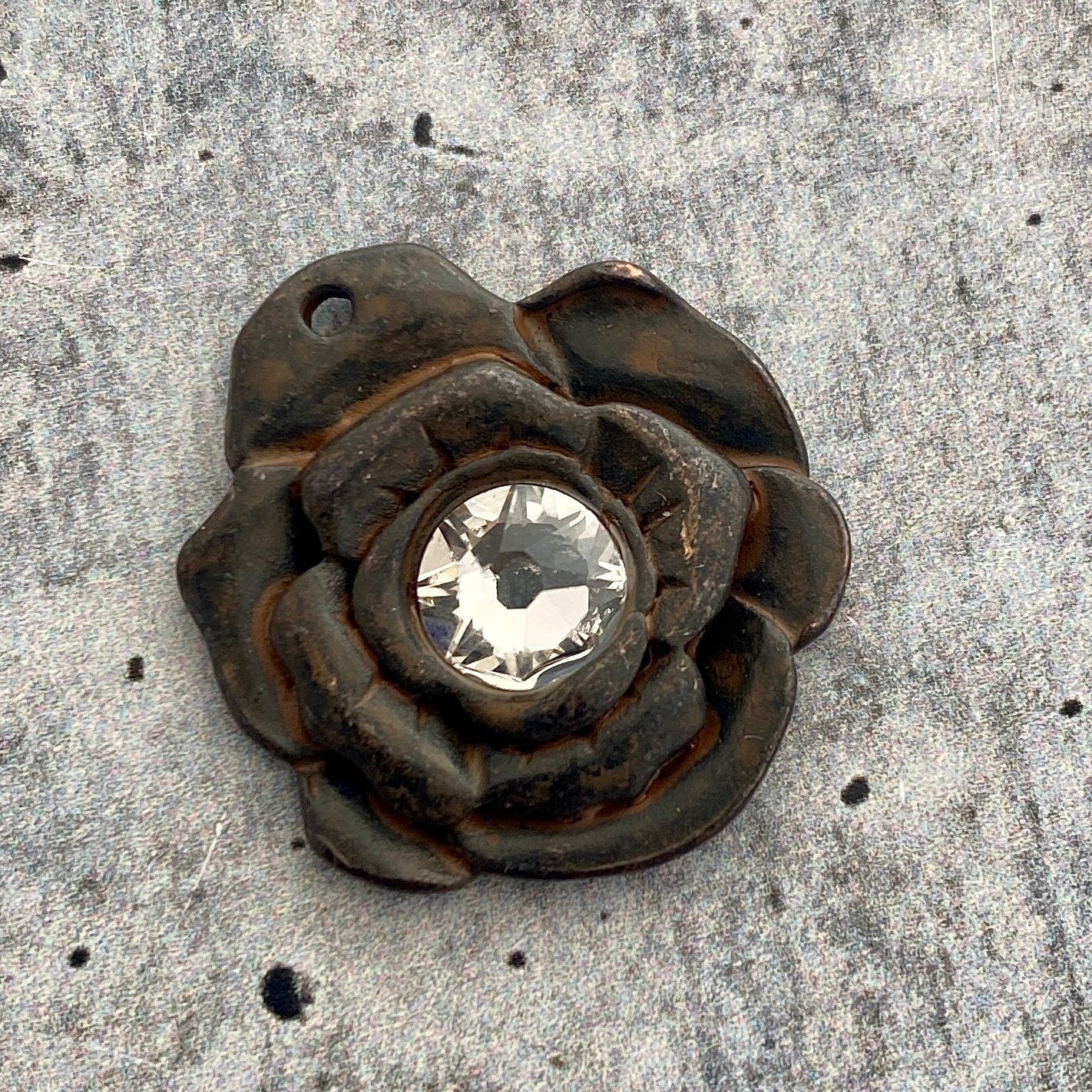 Swarovski Crystal Hammered Rose Flower Charm, Antiqued Rustic Brown Artisan Pendant for Jewelry, BR-6204