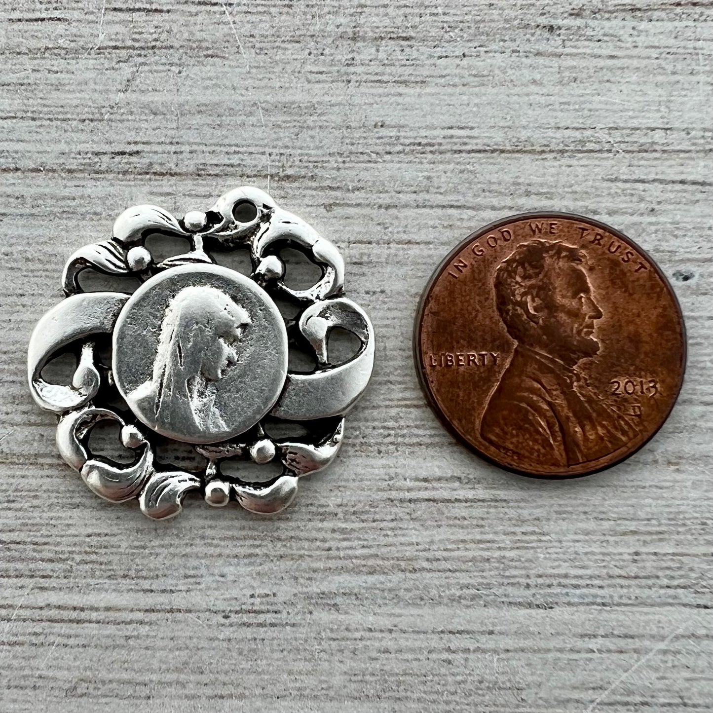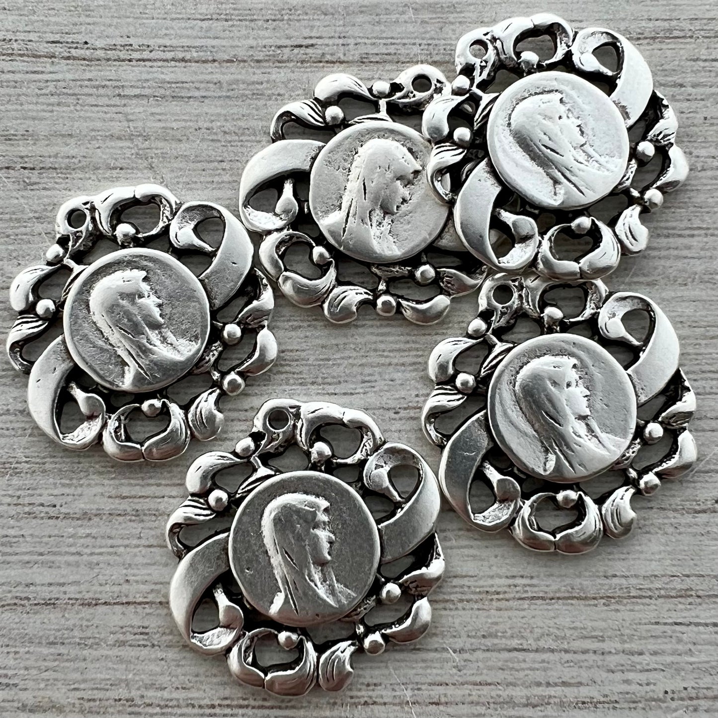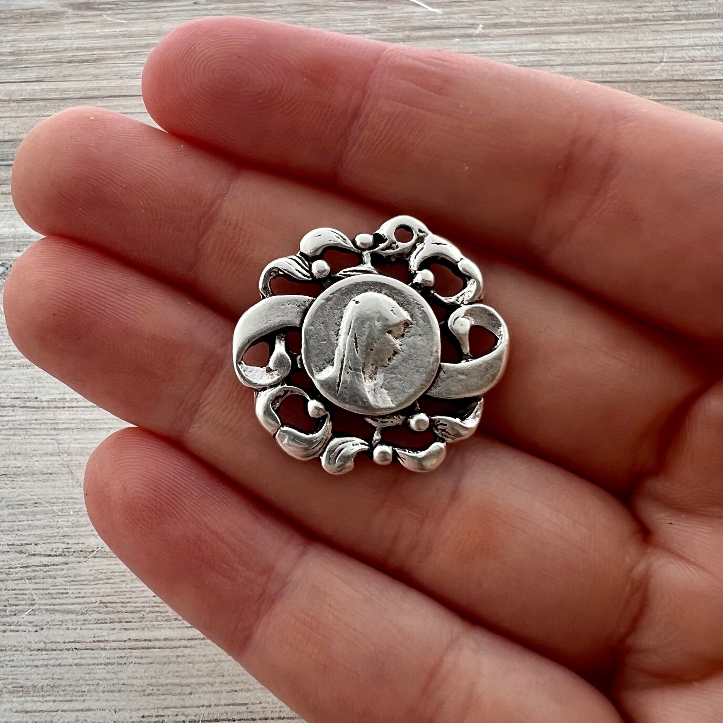 Make a lovely statement with this Virgin Mary medal. A faint silhouette of Mary is surrounded by a filigree frame. This is perfect for all types of jewelry.