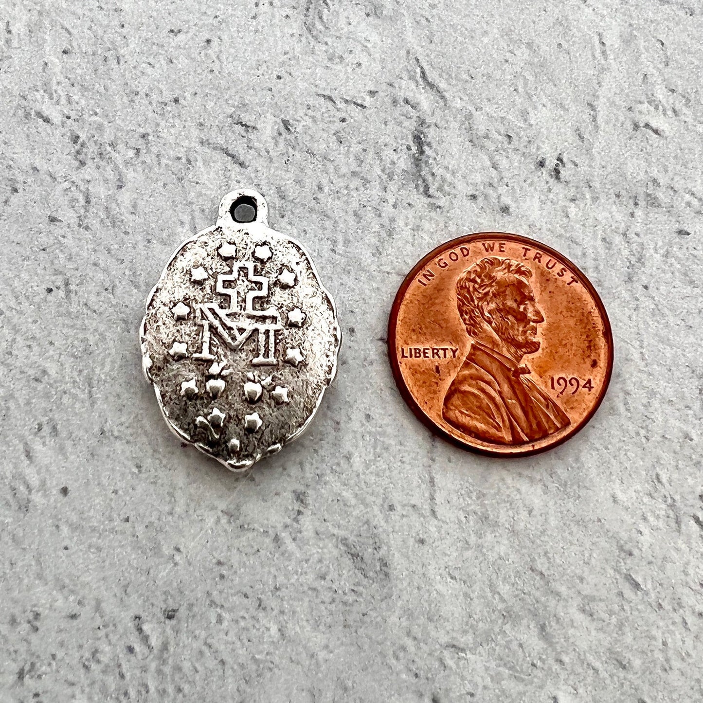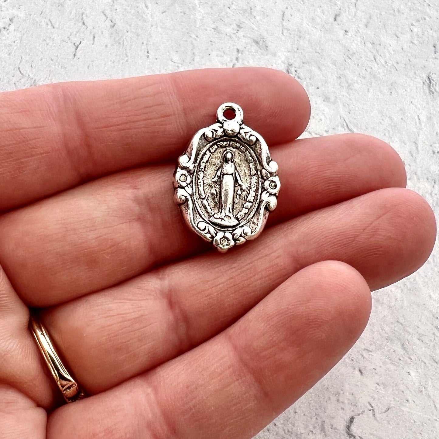 Floral Oval Miraculous Mary Medal, Antiqued Silver Religious Jewelry Making Charm Pendant, Catholic Jewelry, SL-6221