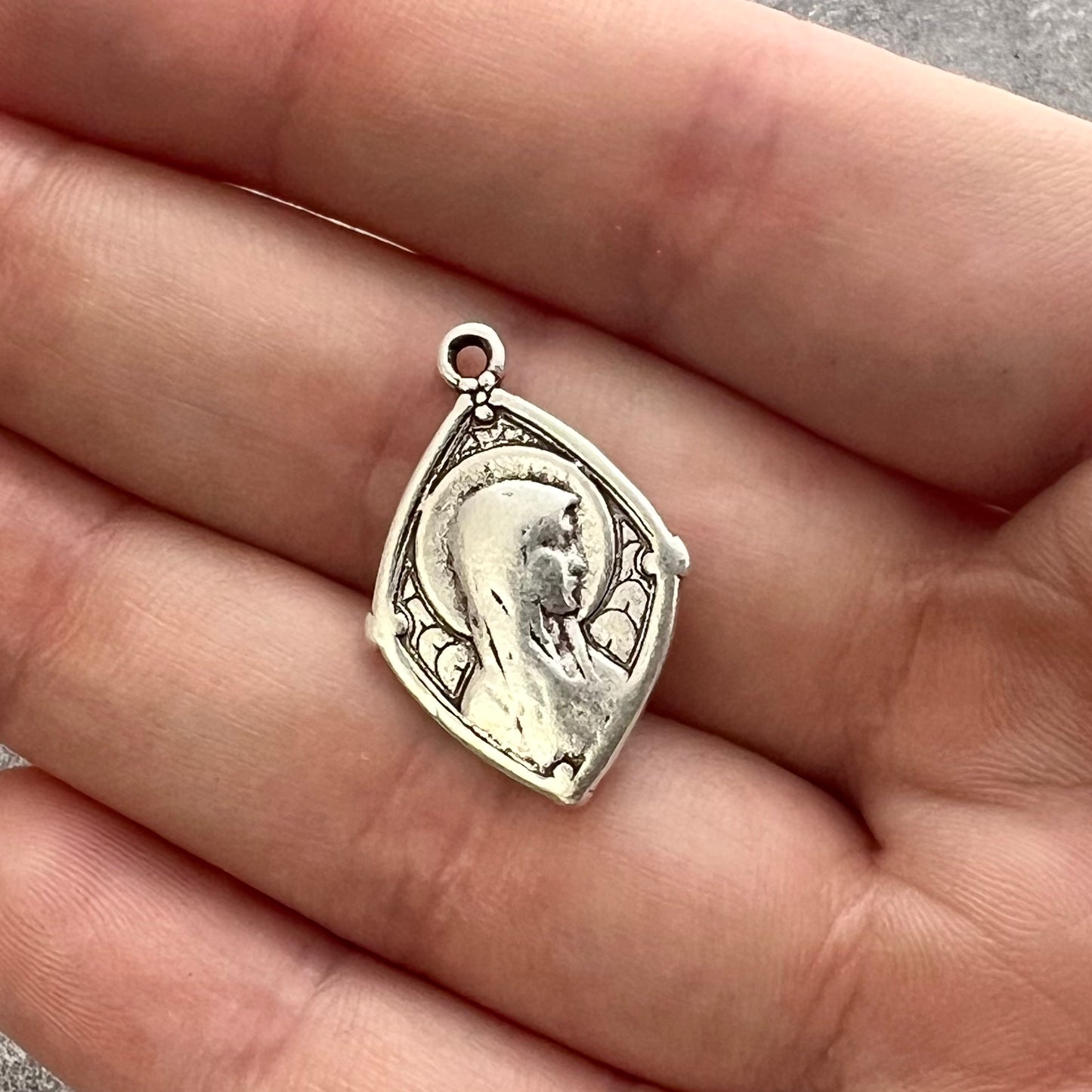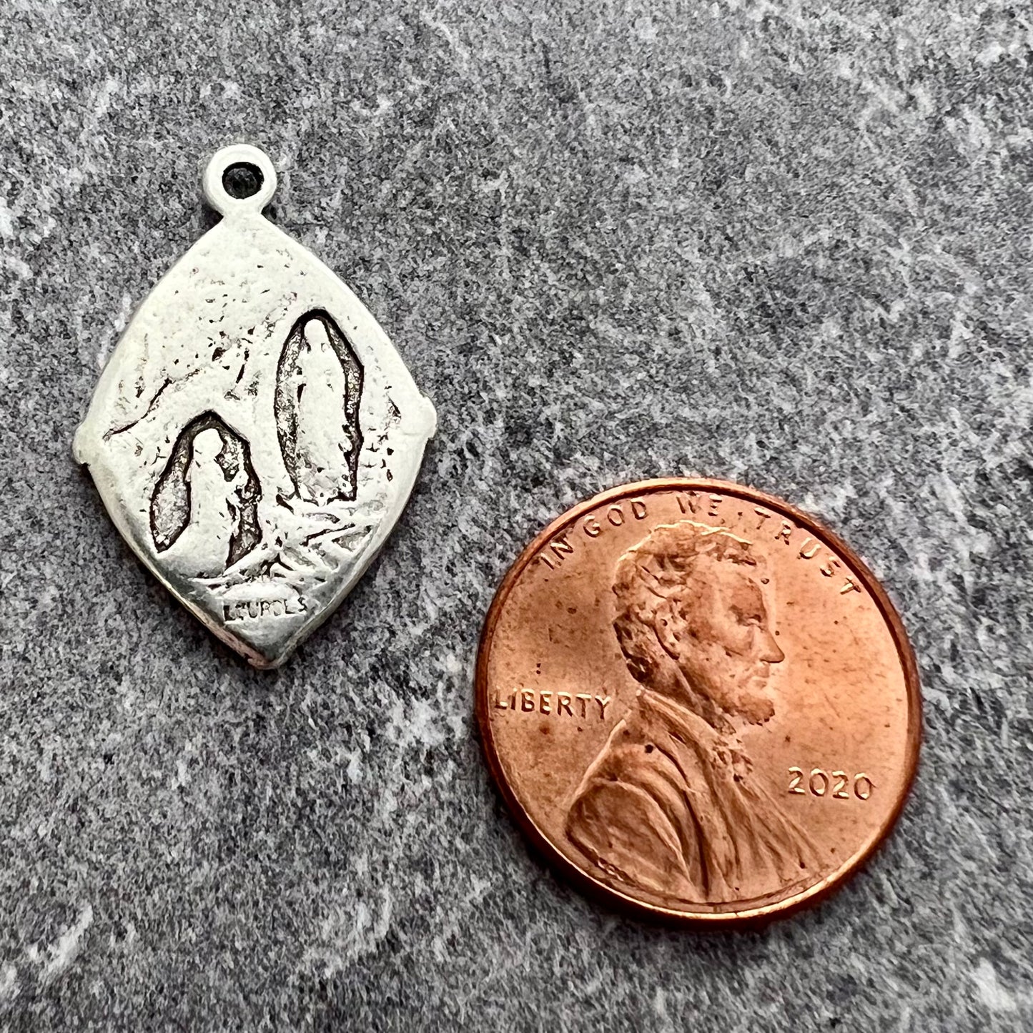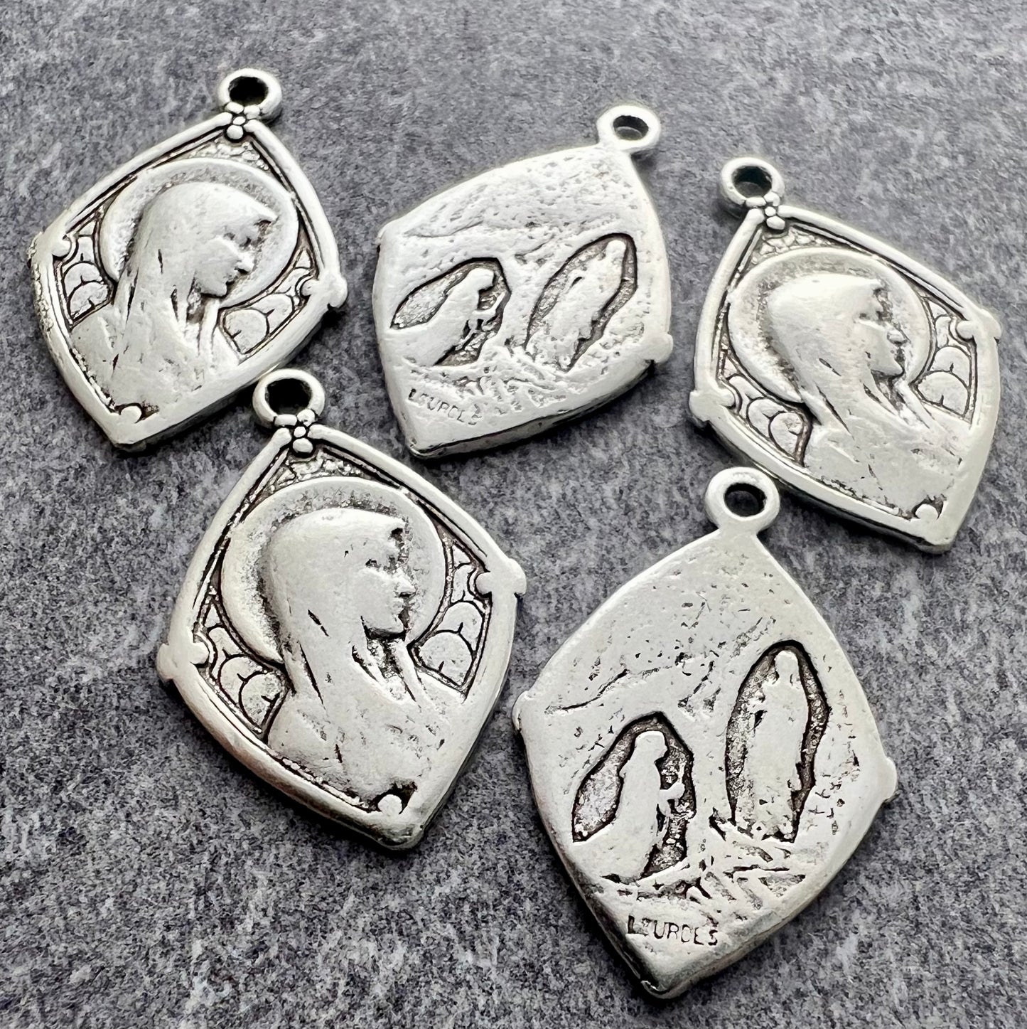 This unique and lovely medal depicts the Virgin Mary on the front, and apparition of Lourdes on the back.