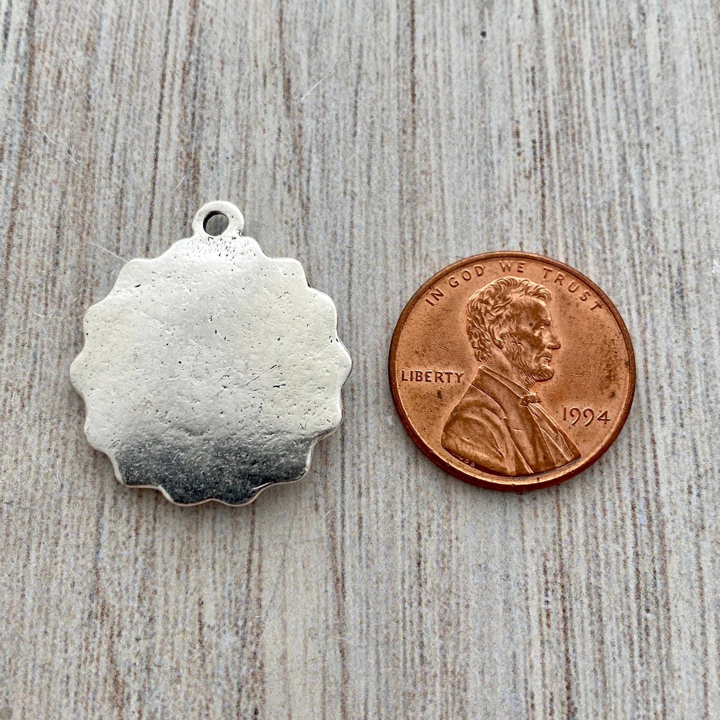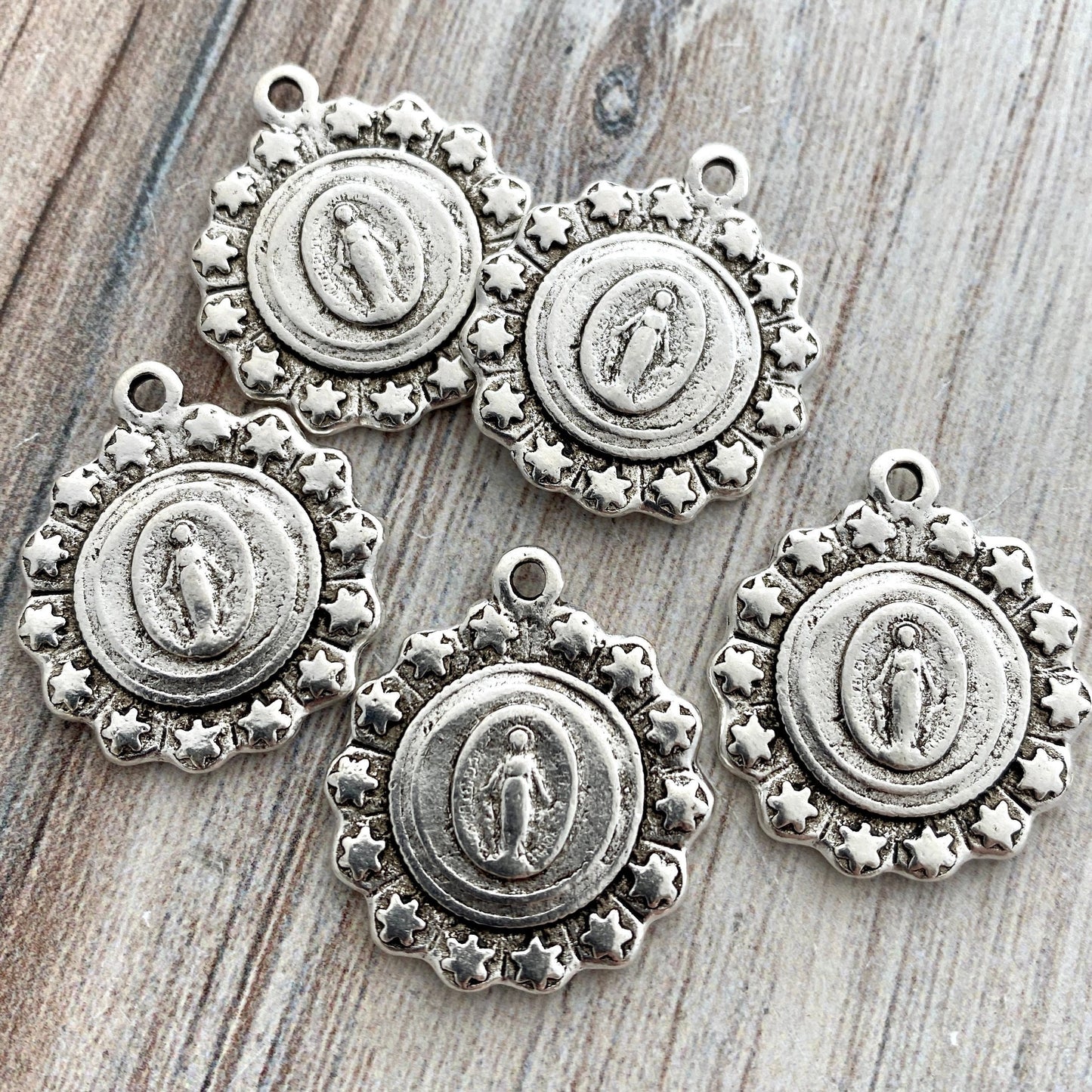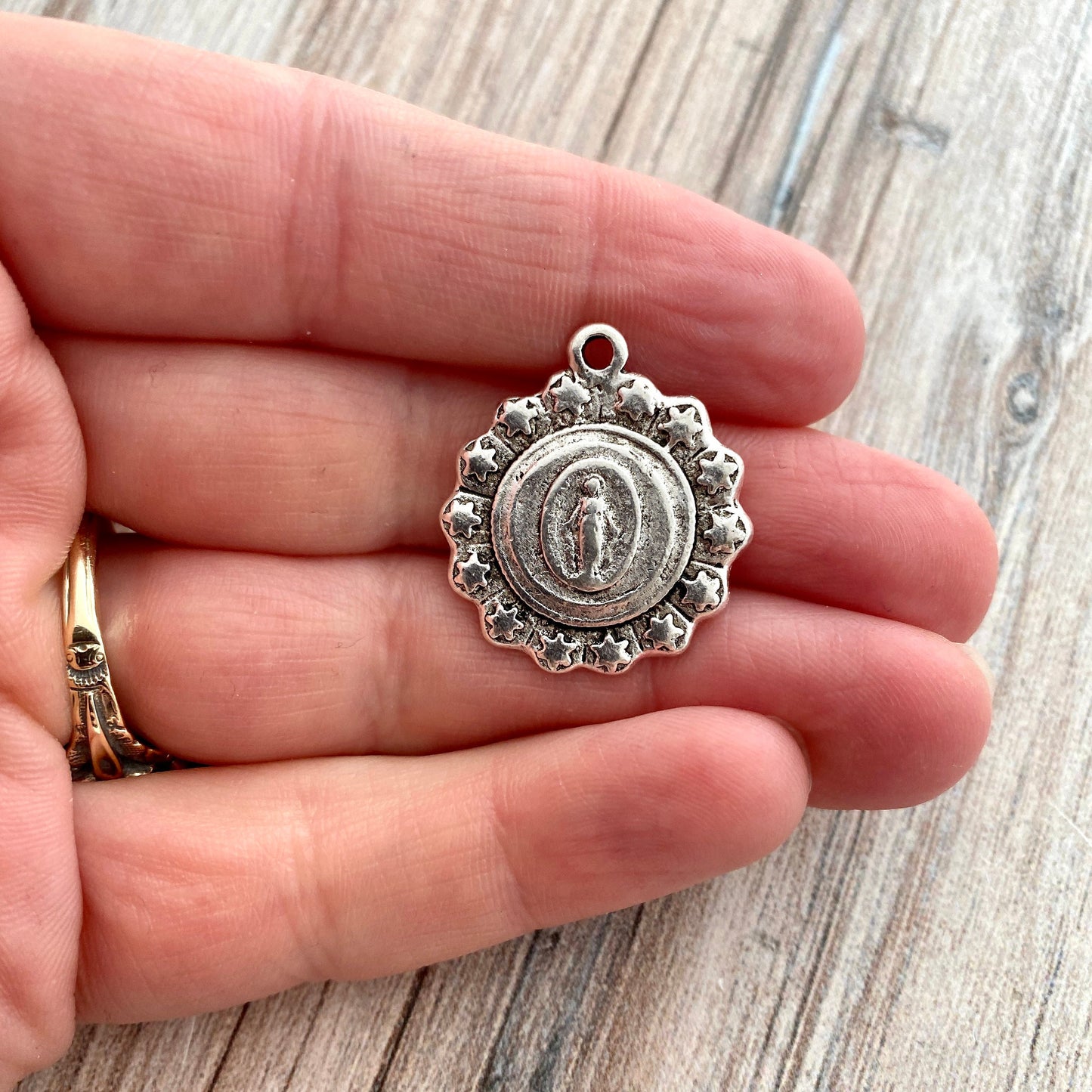 What a unique and lovely medal this is! This medal depicts the Virgin Mary surrounded by 14 small stars. Use this as a remind of God's love and protection.