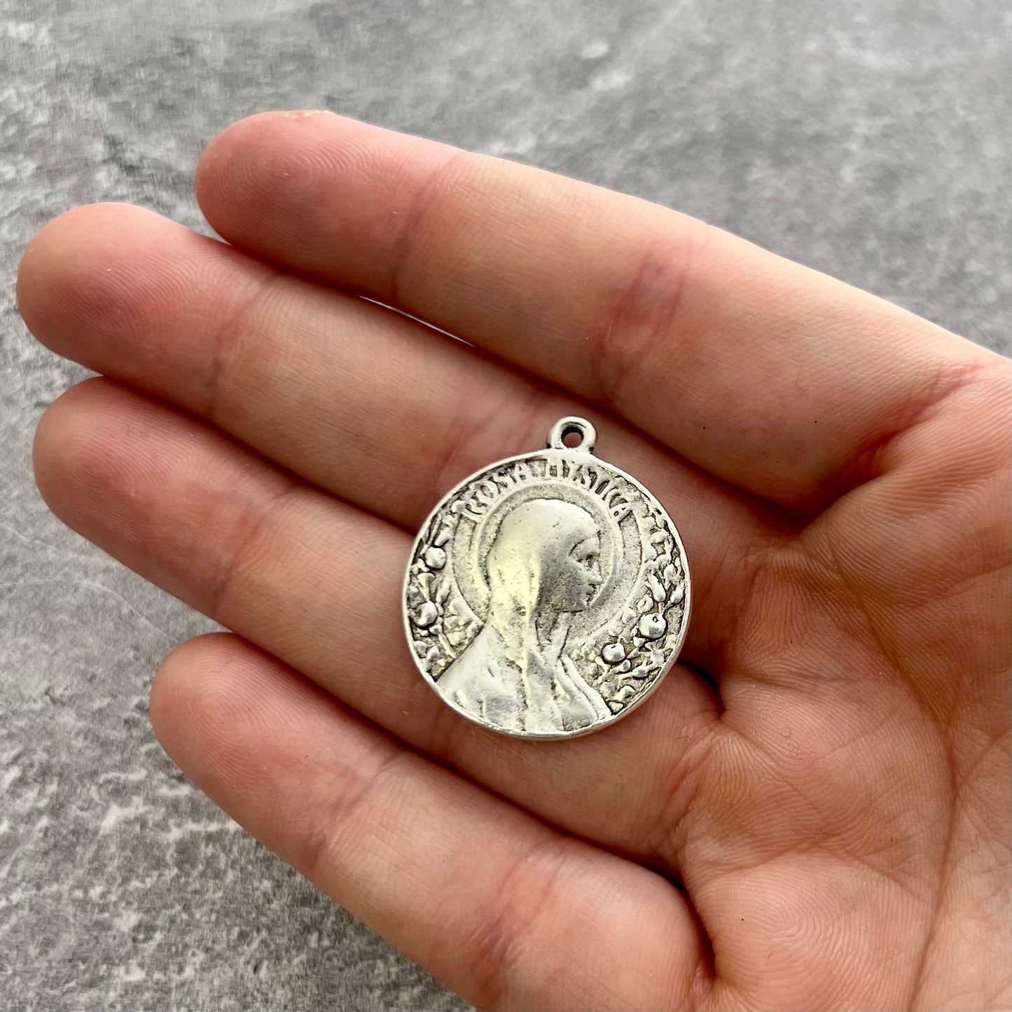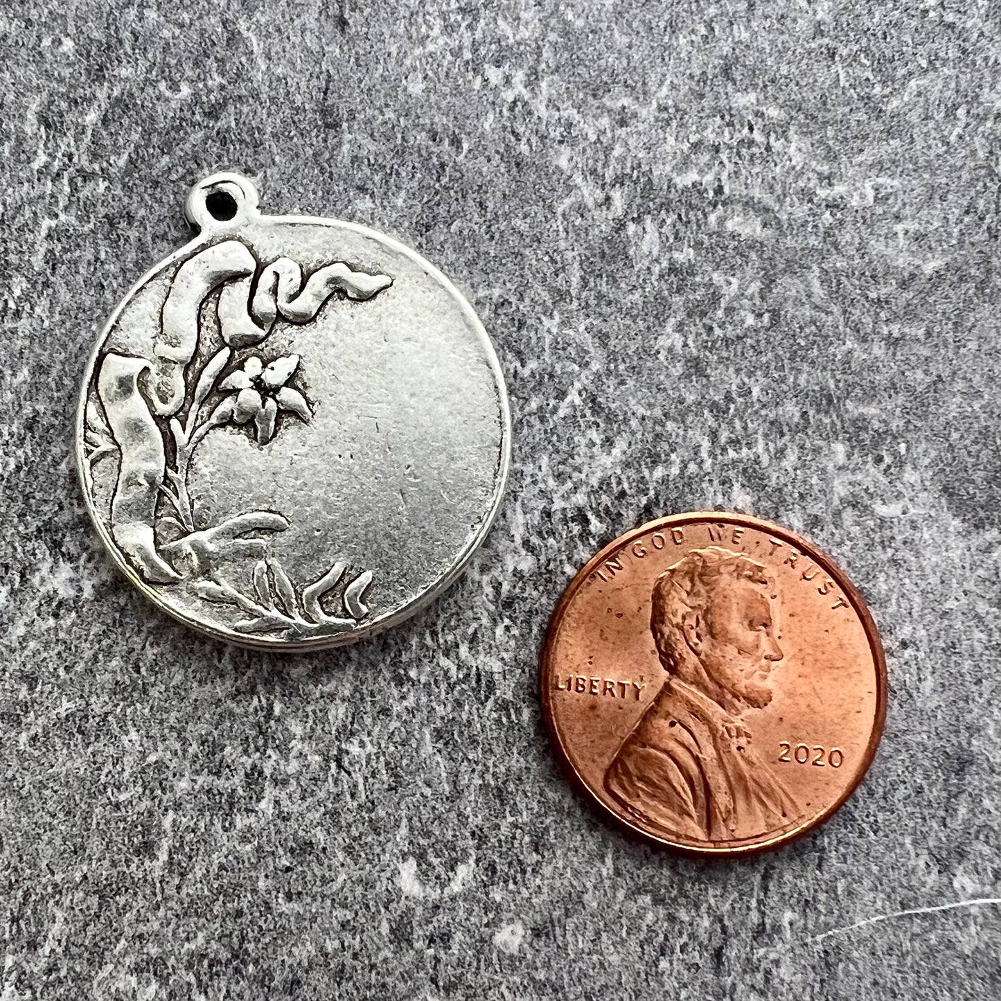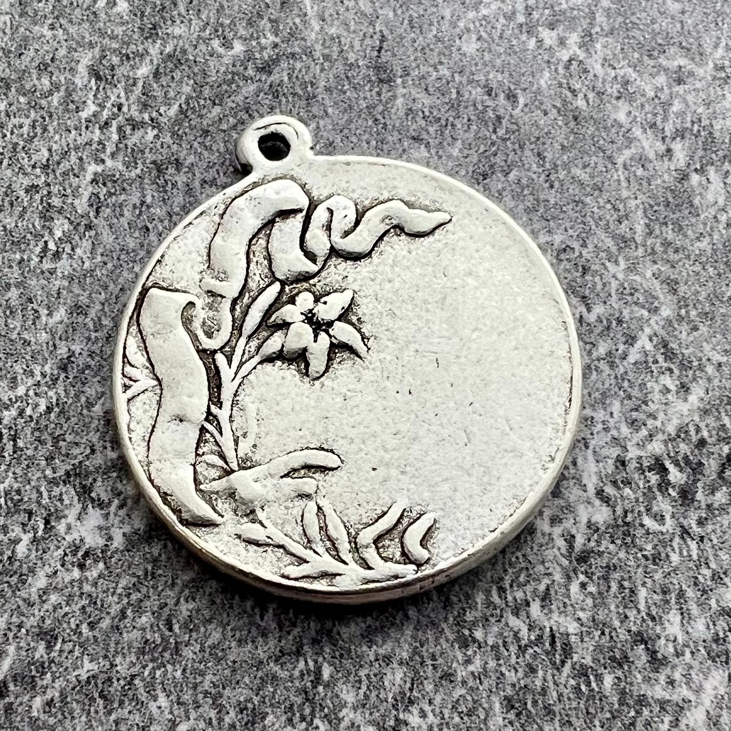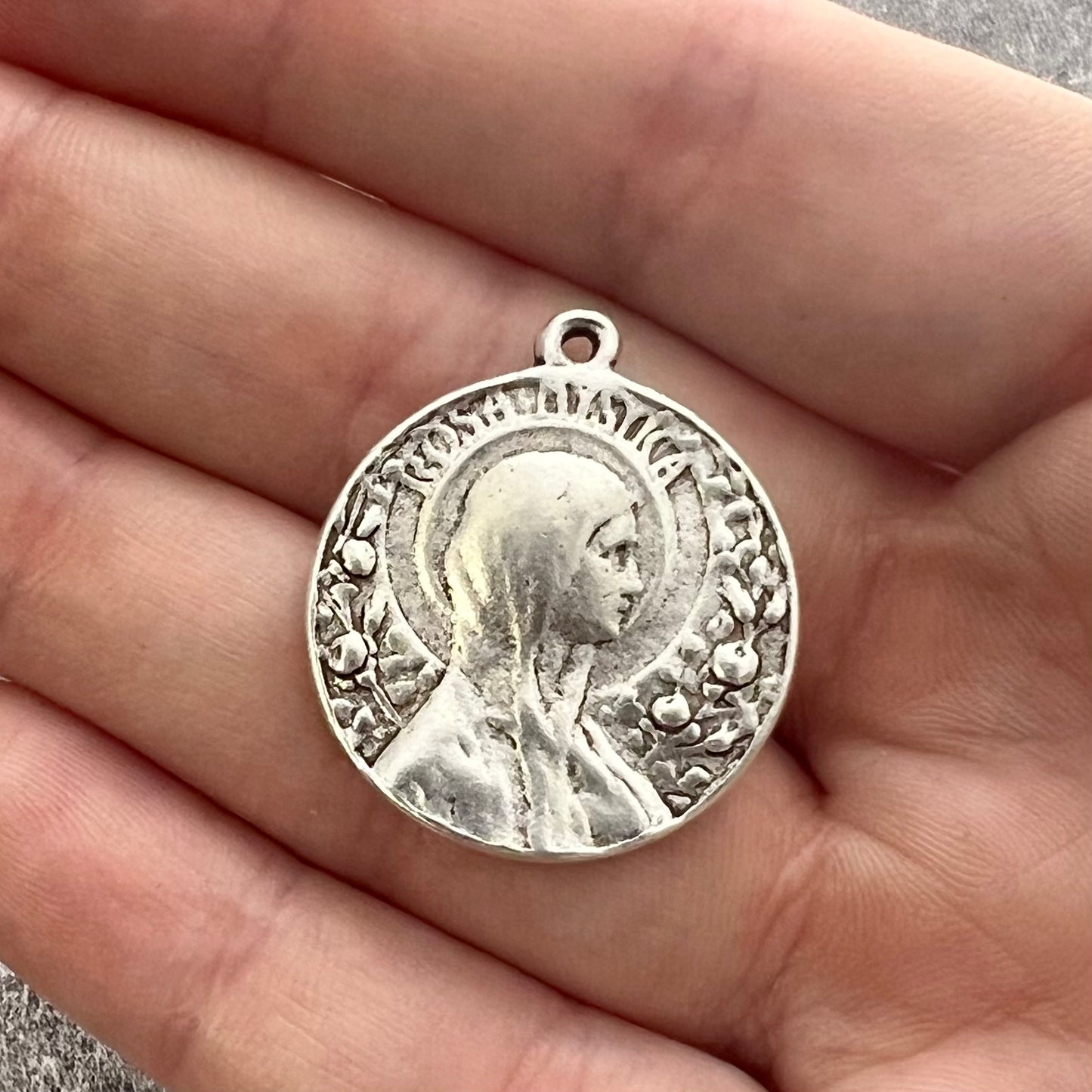 Rosa Mystica refers to Mary as a "Mystical Rose." This beautiful medal depicts roses and flowers in an Art Nouveau style.
