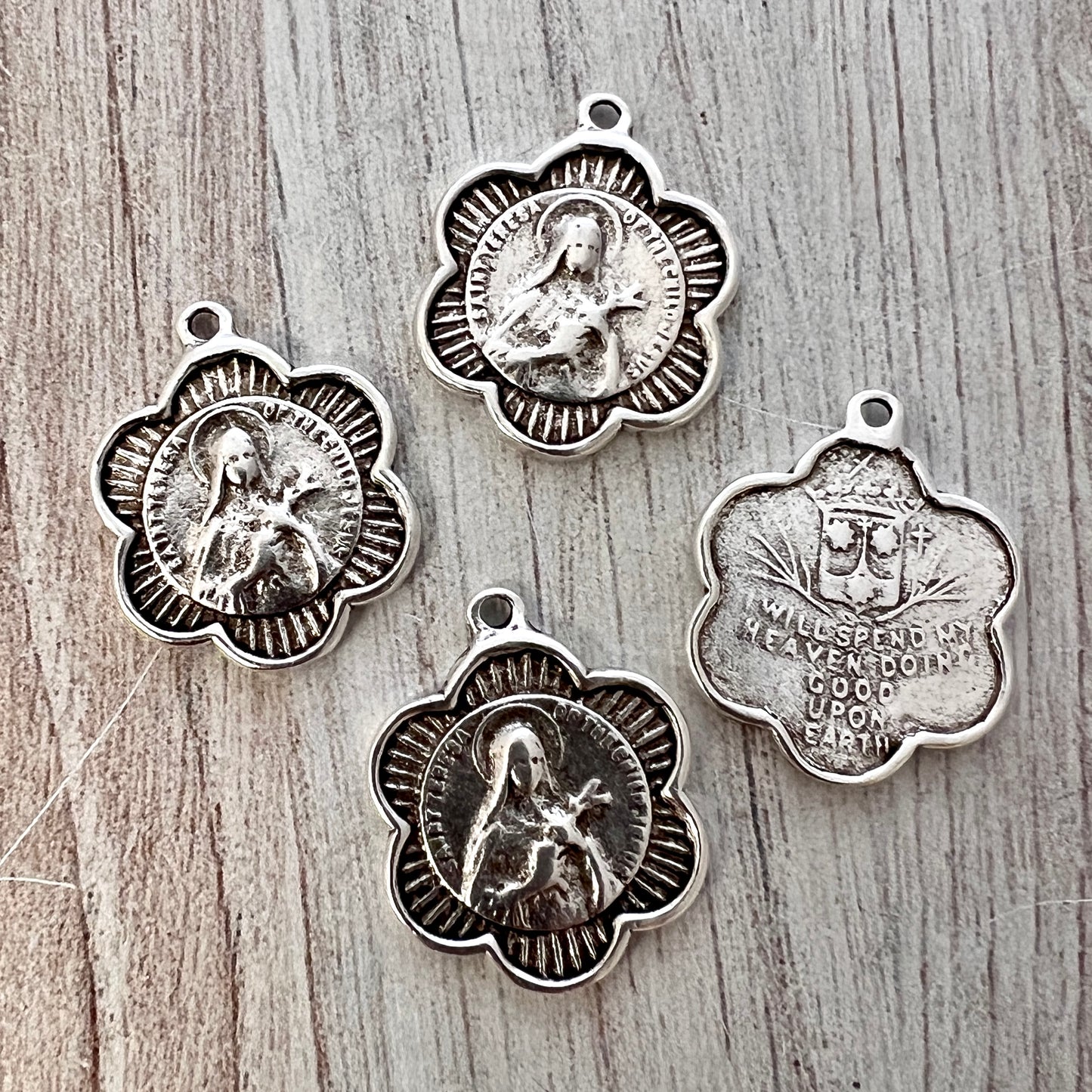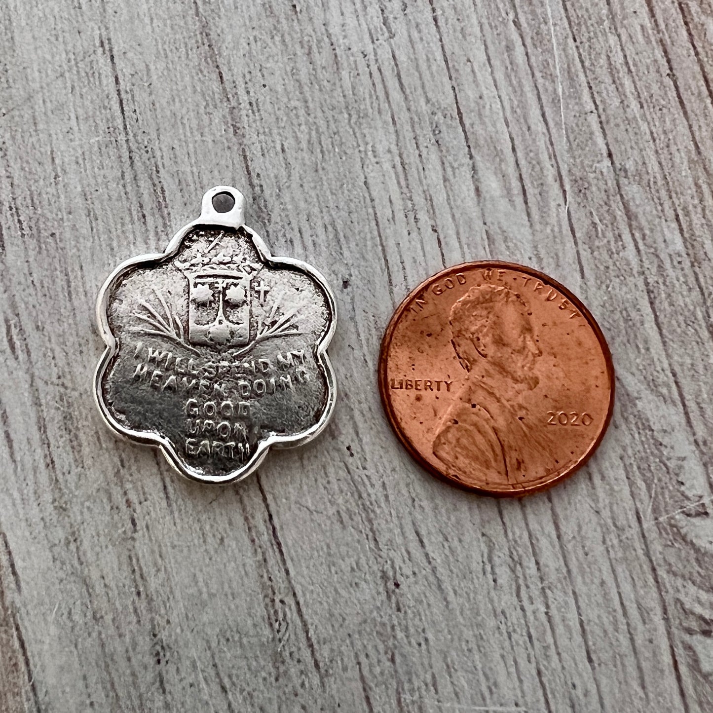 This flower-shaped medal is made from a well-loved, vintage medal of St. Therese de Lisieux. The front says, "Saint Teresa, of the Child Jesus." The back says, "I will spend my heaven doing good upon Earth."
