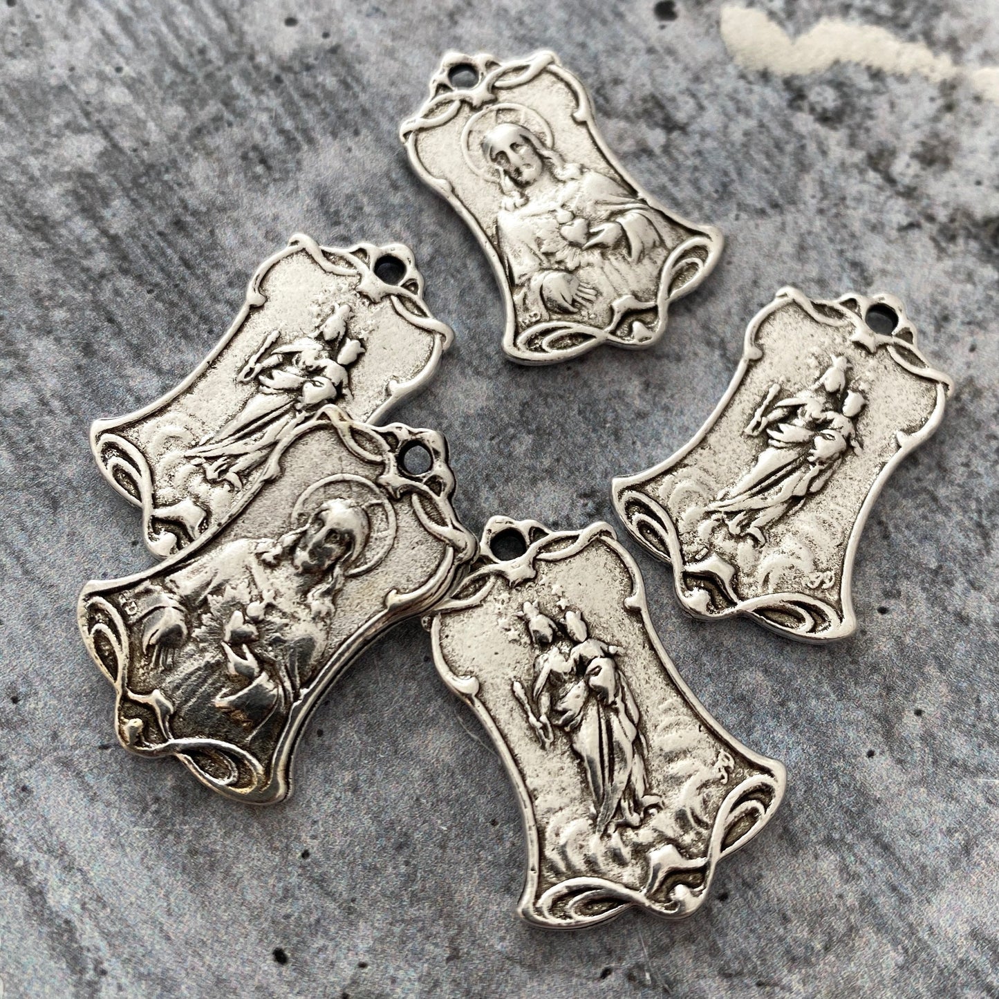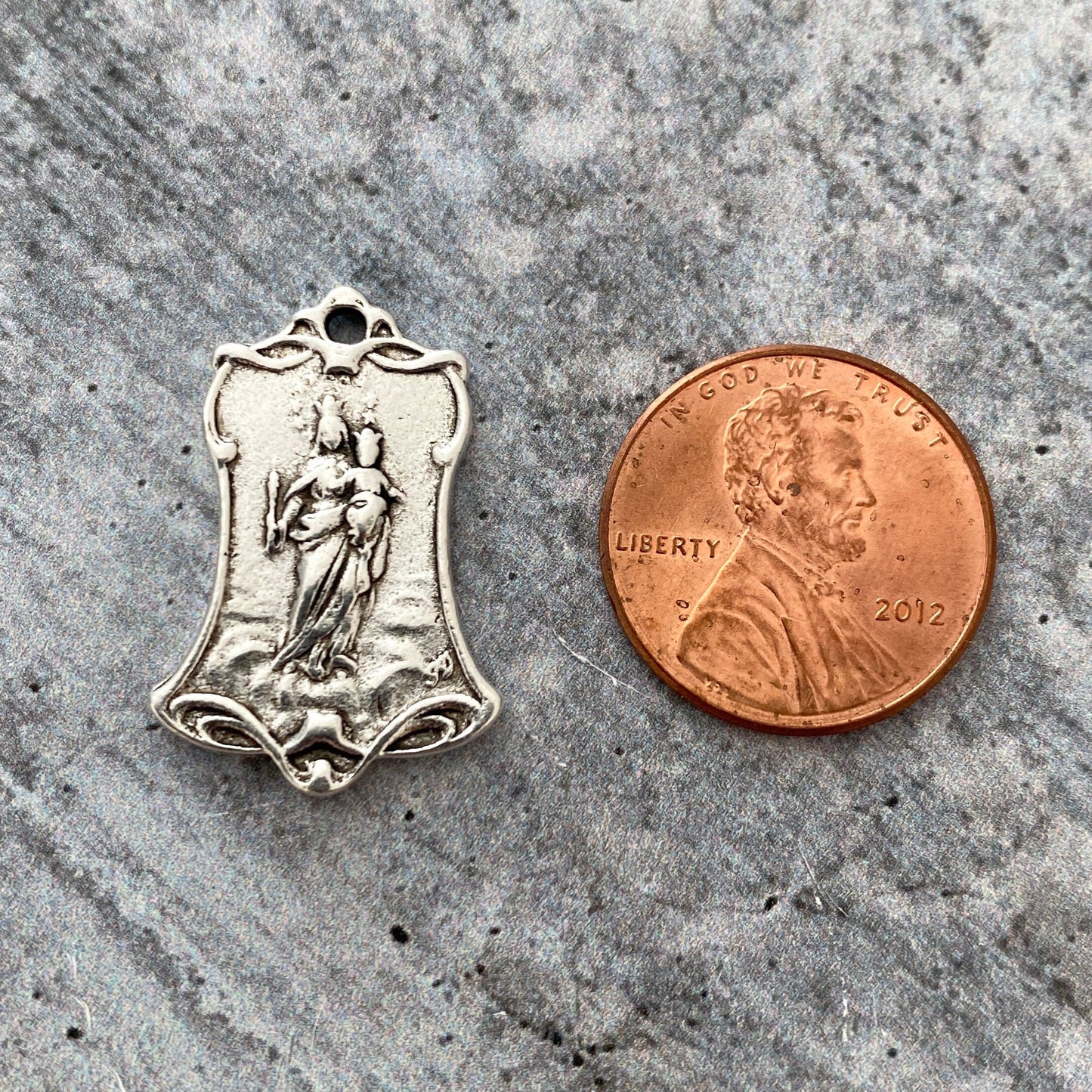 This lovely, Art Nouveau style medal depicts the Virgin Mary and child on one side, and Jesus Christ and Sacred Heart on the other. The shape as a whole is reminiscent of a bell. The size of this makes it so versatile - use it for a necklace, earrings, bracelet, or even a keychain.