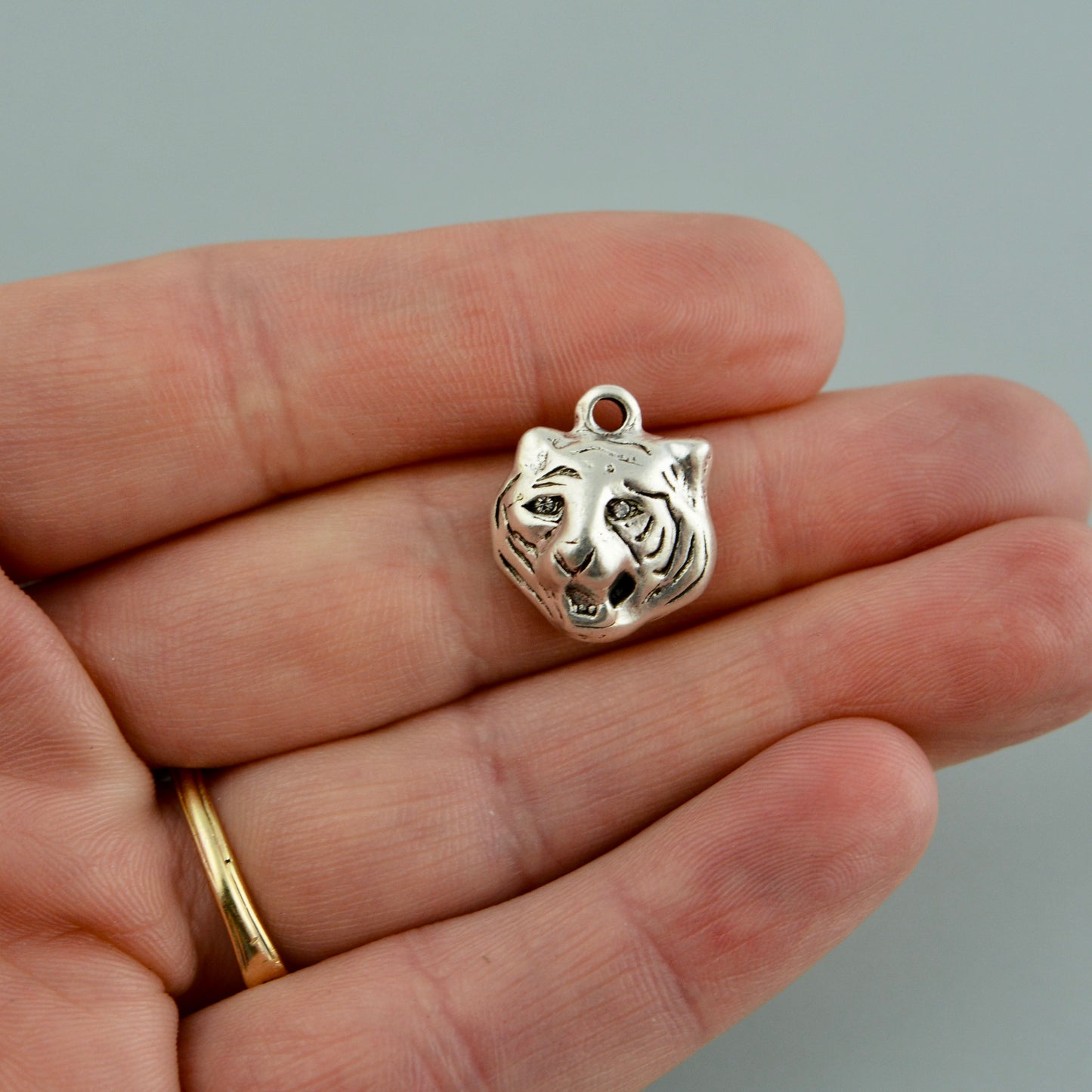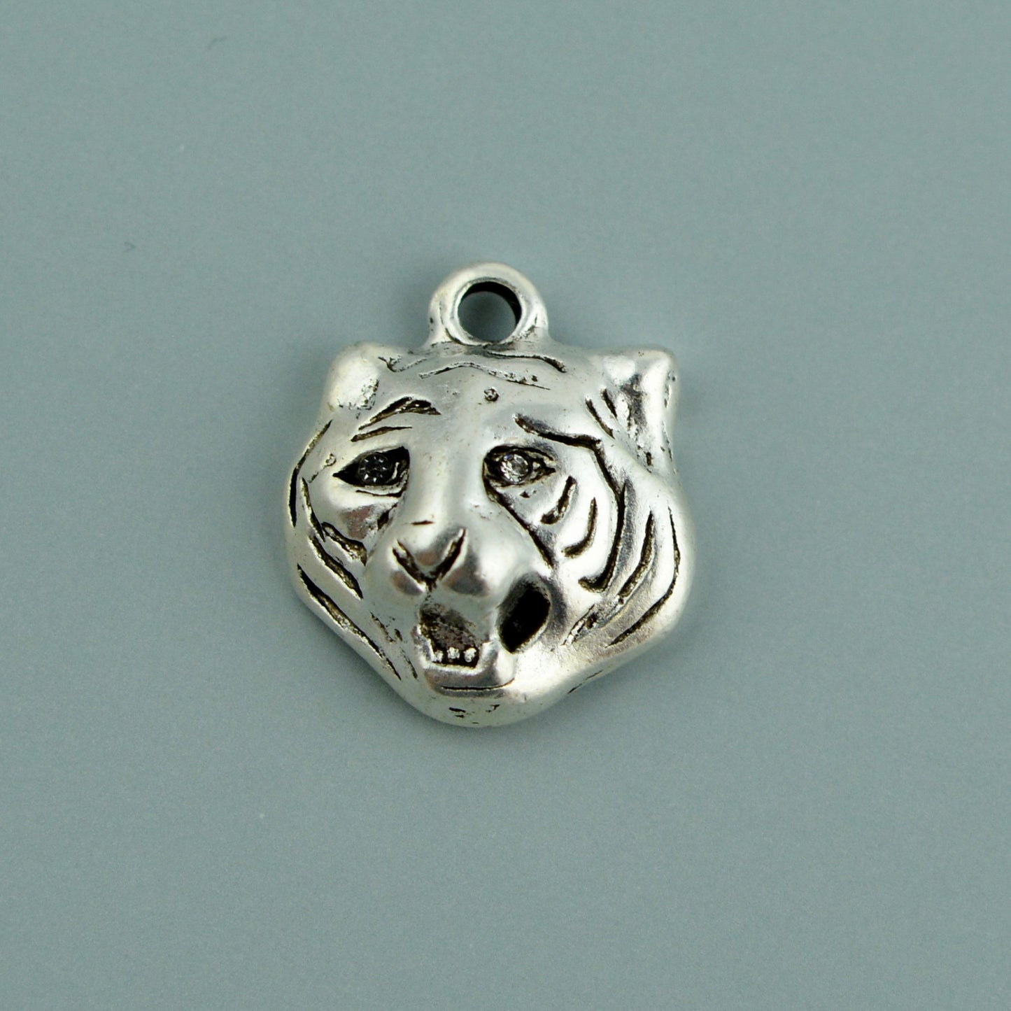 Tiger Charm with Rhinestone Eyes, Silver Cat, Mascot Animal, Jewelry Making Supplies, SL-6353