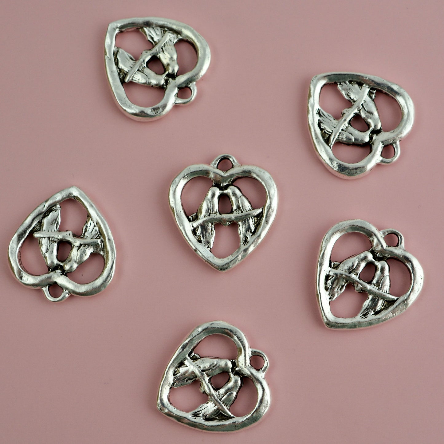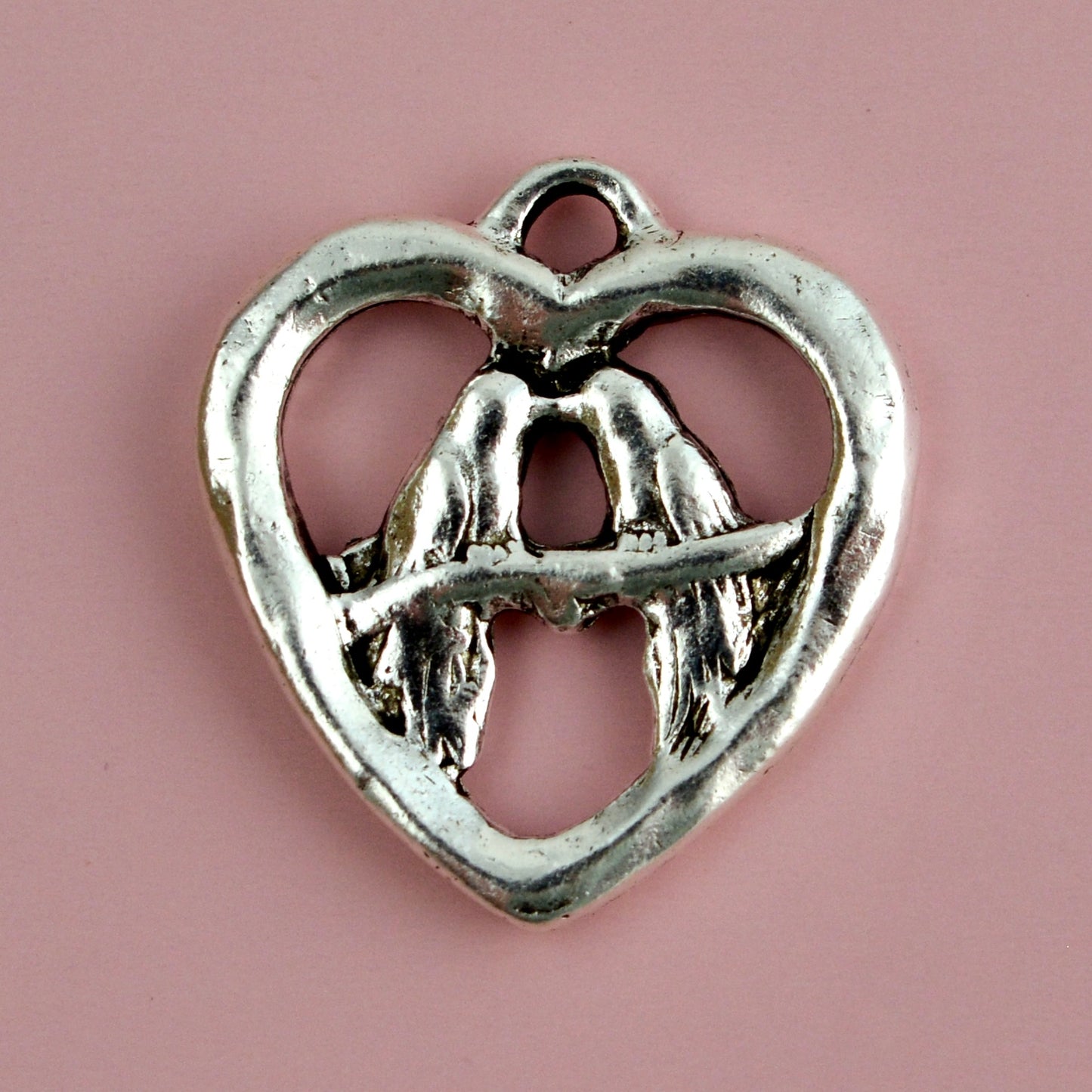 Silver Lovebirds Charm, Heart Pendant, Artisan Vintage Jewelry Making Supplies, SL-6362