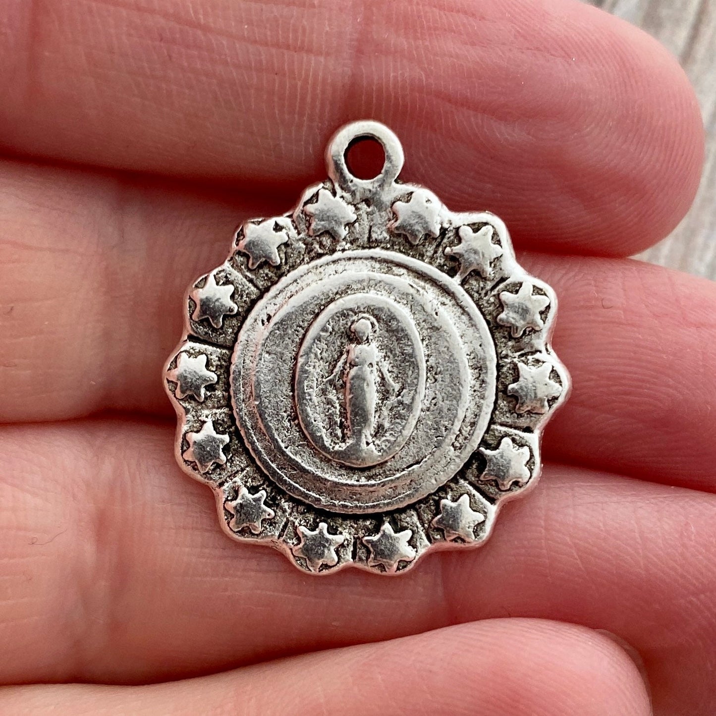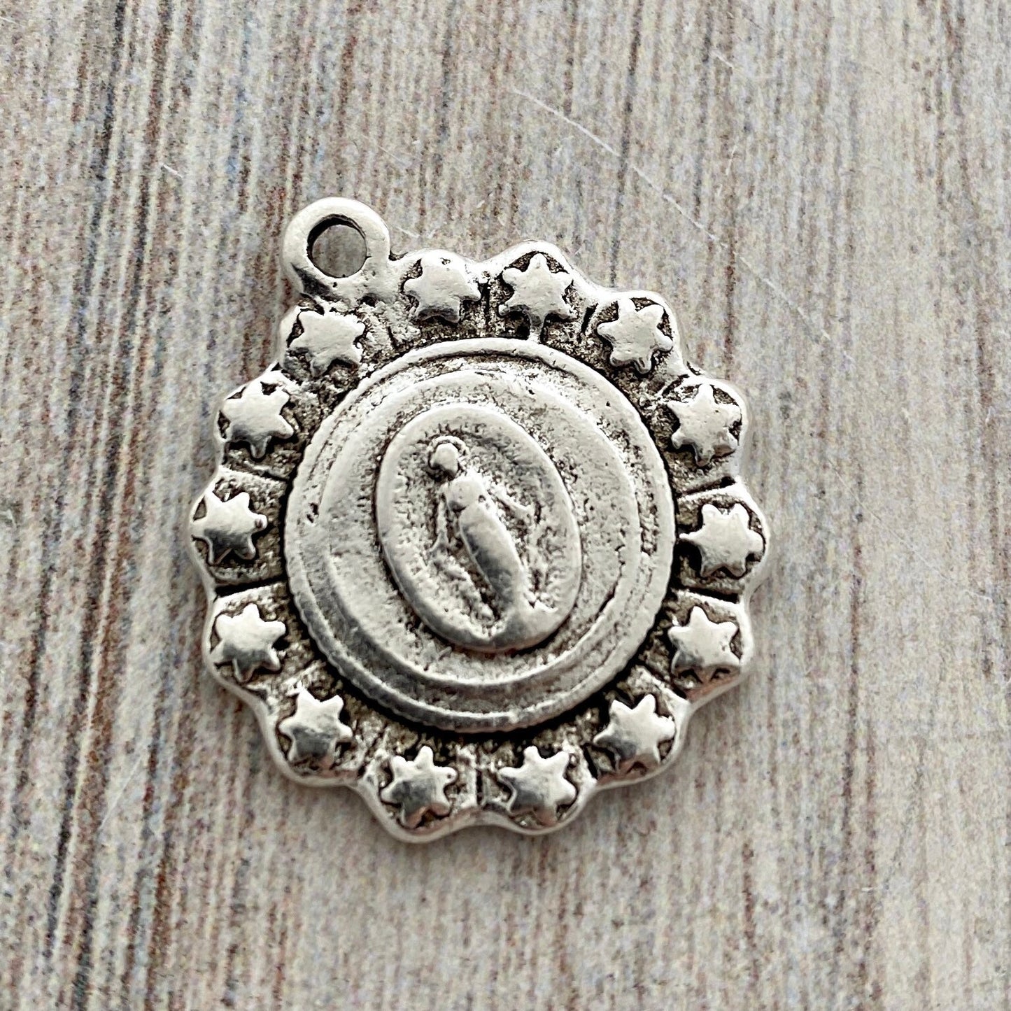 Mary Medal with Stars, Antiqued Silver Charm, Religious Rosary Parts, Catholic Pendant, Christian Jewelry, SL-6152
