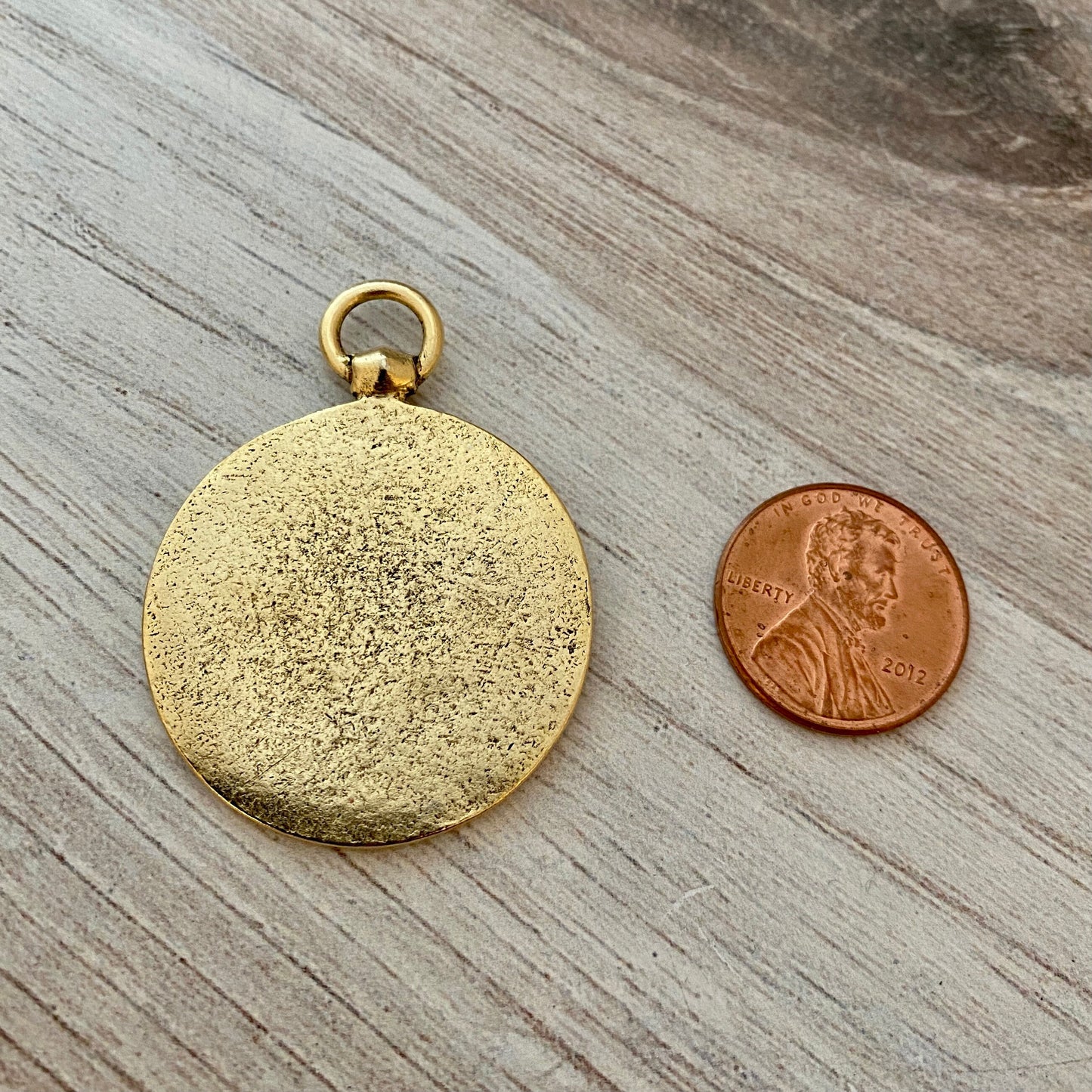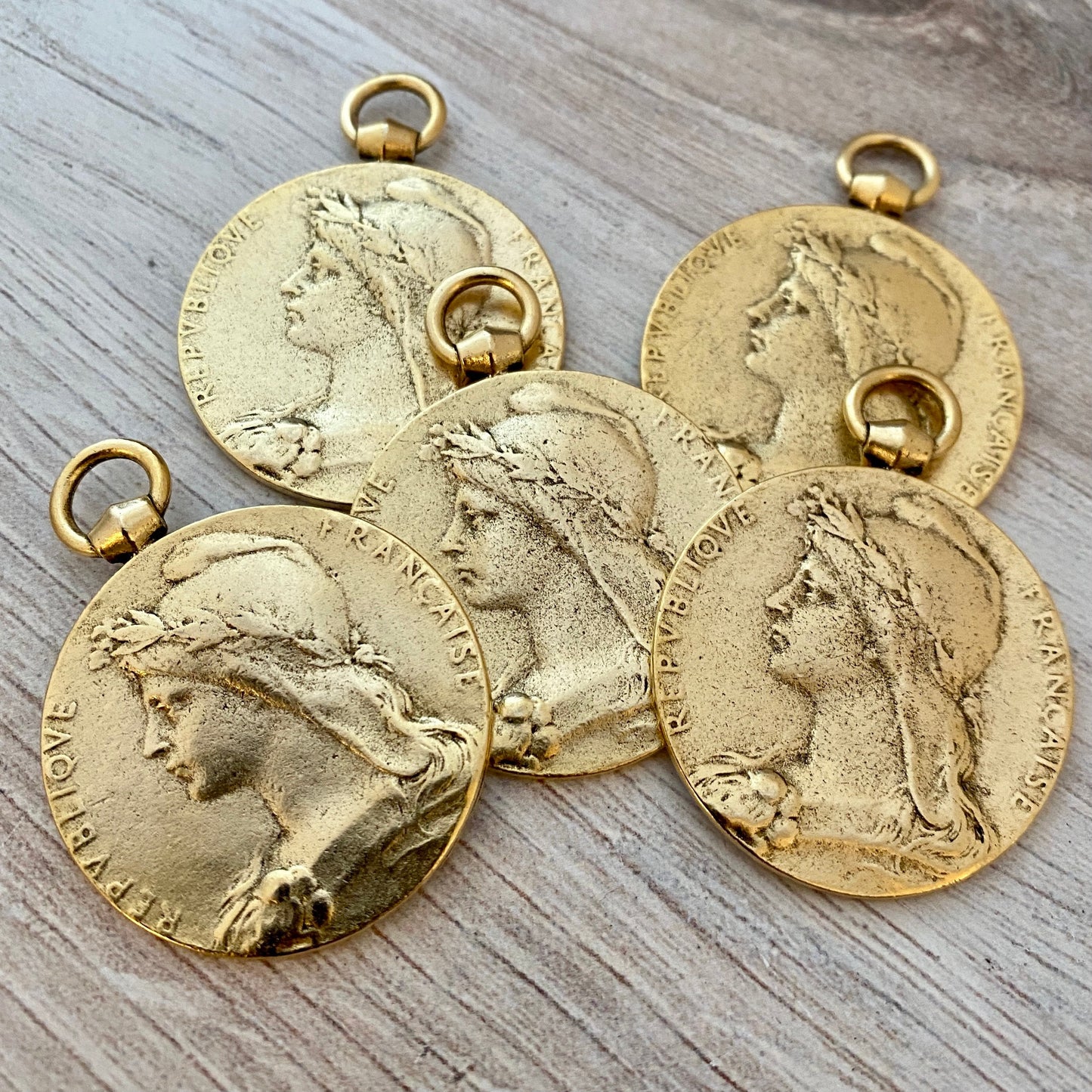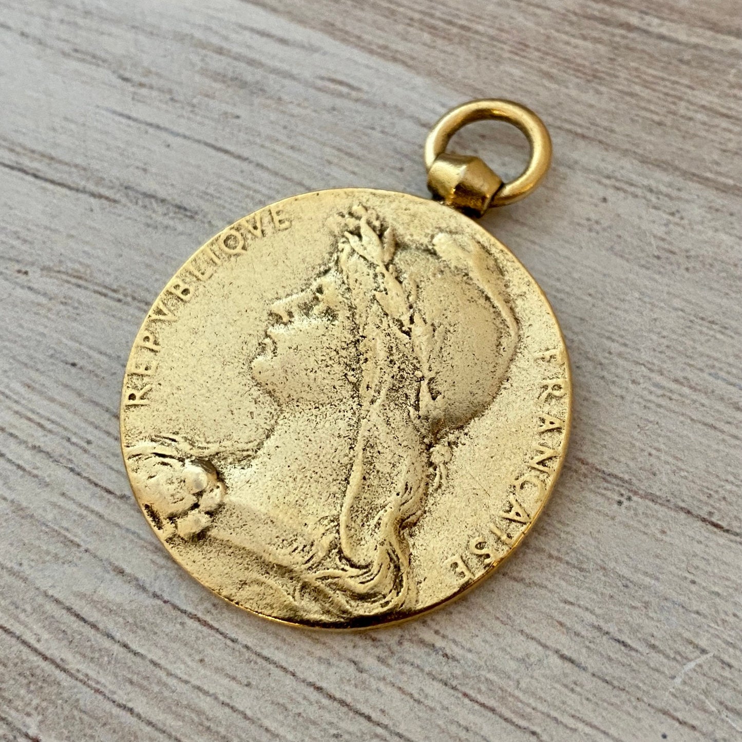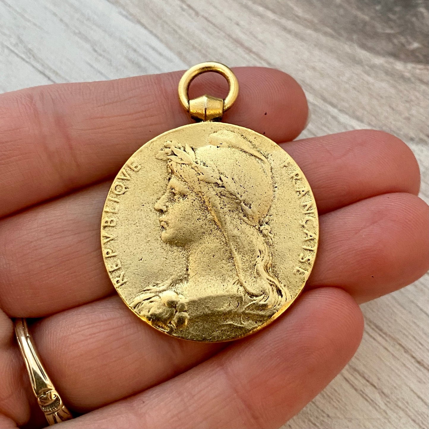 This French medal replica depicts Marianne, who is the personification of the French Republic since the revolution. She stands for liberty, equality, and reason. Similar to the American Statue of Liberty, she is a portrayal of the Goddess of Liberty. This medal is large, and it's excellent for a long necklace, or a short statement necklace. The writing says, "Republique Francaise."