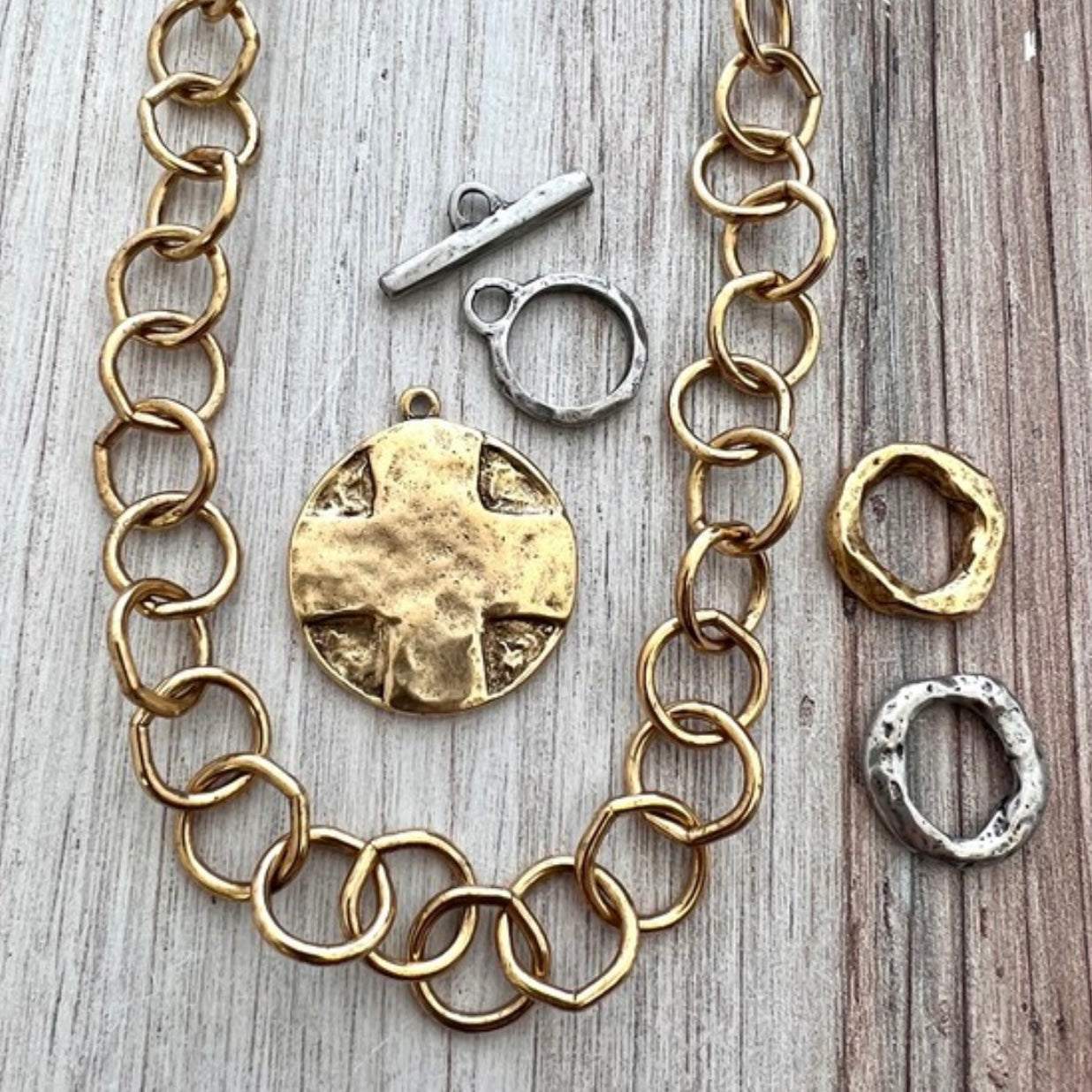 CC pewter components are made of high-quality pewter that is free of lead and cadmium. Most CC chain is made of regular steel, and some is made of brass. It is then plated with the various CC finishes. CC plating is known to hold up very well over time, but as always with any plated items, we recommend keeping it away from water and perfume.
