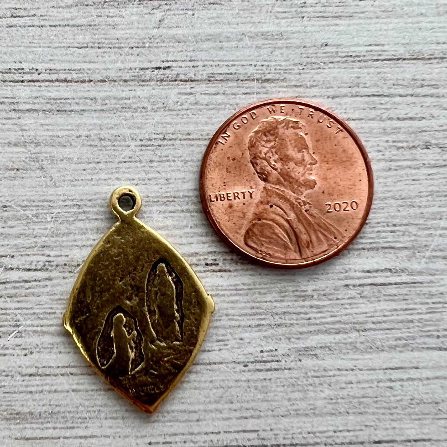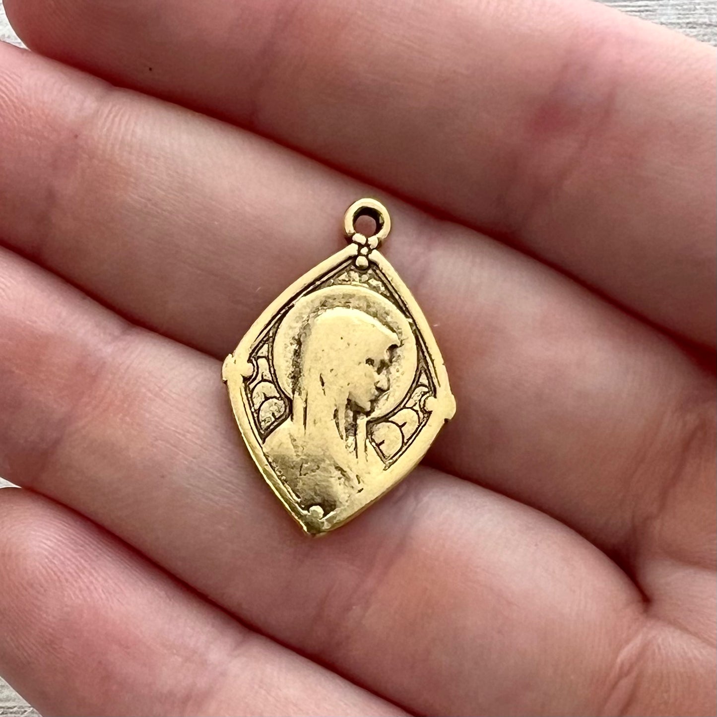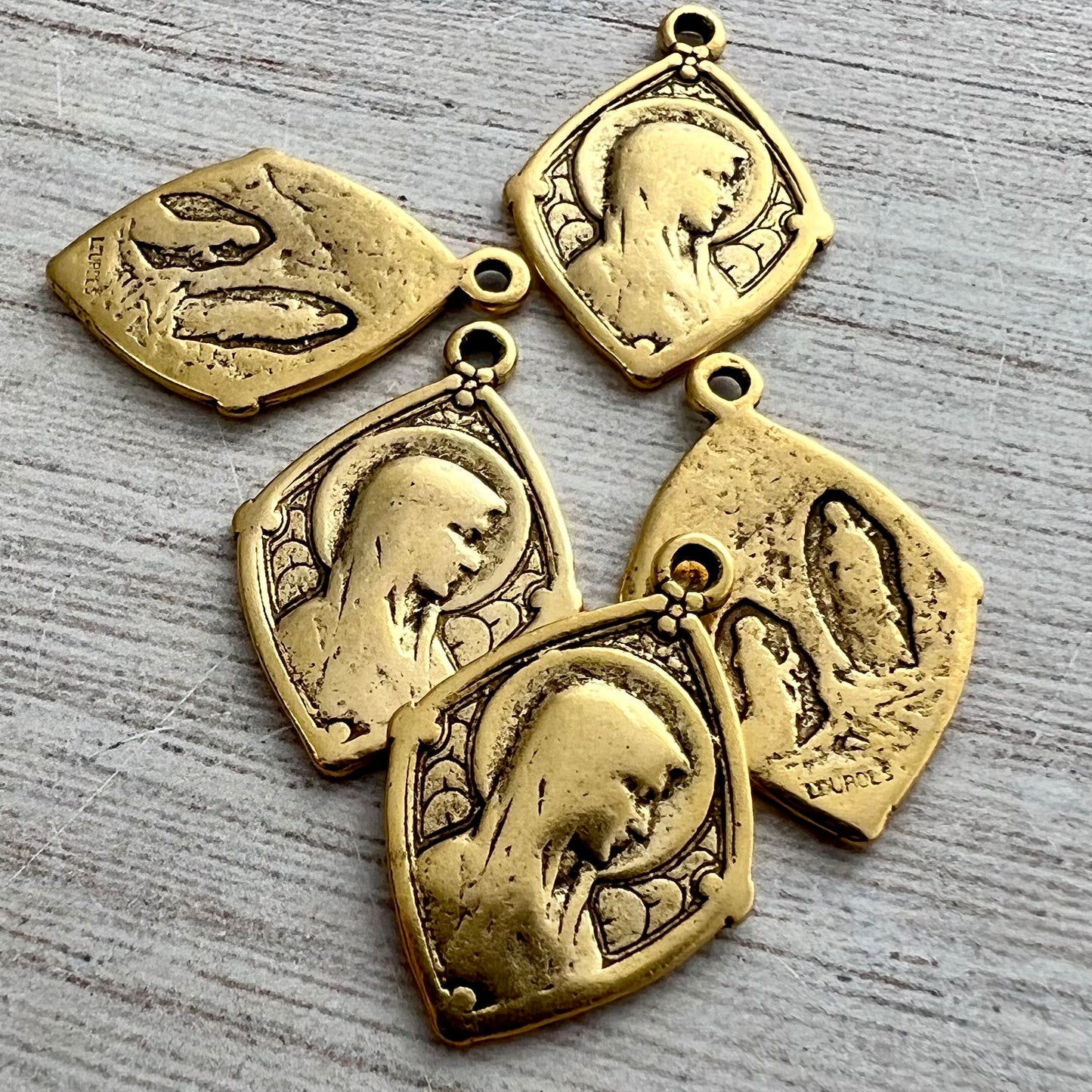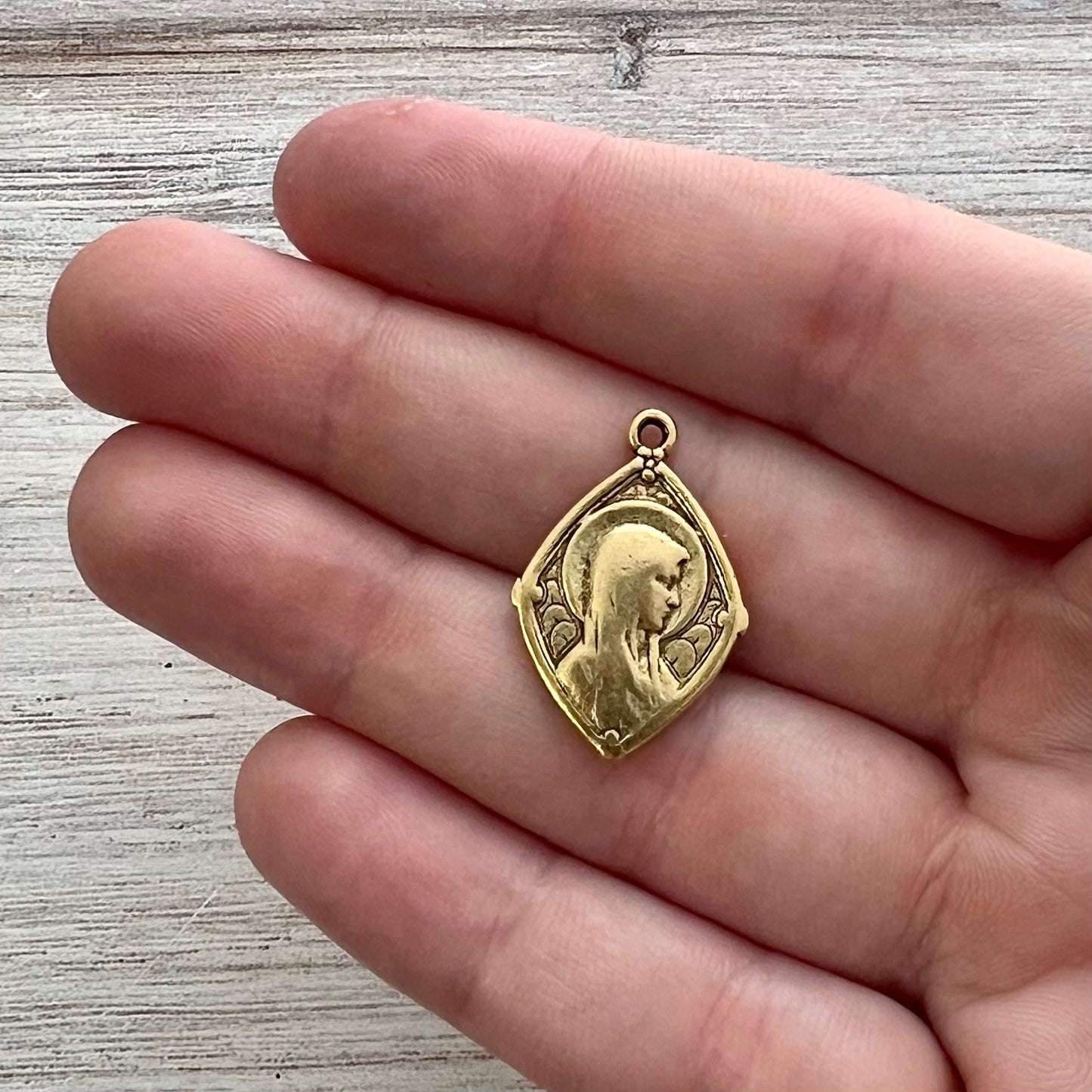 This unique and lovely medal depicts the Virgin Mary on the front, and apparition of Lourdes on the back.