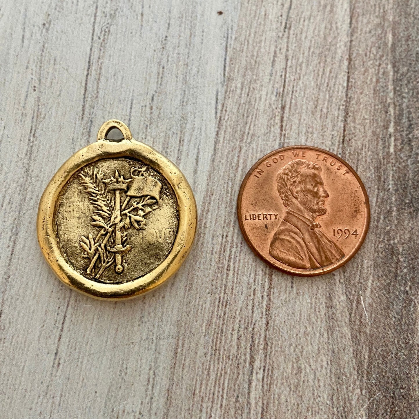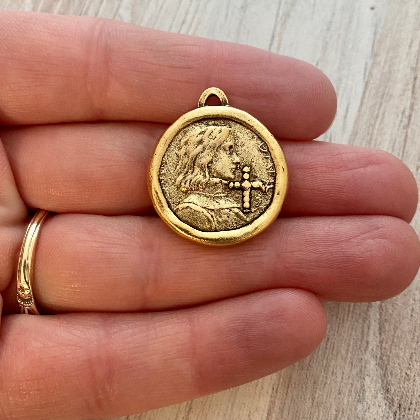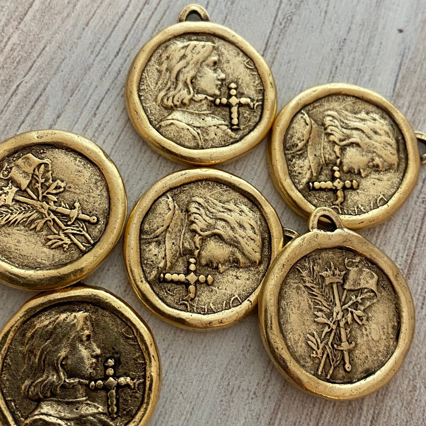 This unique and lovely soldered medal depicts Joan of Arc. I love her as a historical figure and saint because she was intently brave and lived a life that followed her convictions. She is known as the patron saint of soldiers. “There is great pity in the kingdom of France.” That is what the Archangel St. Michael told Joan of Arc in the year 1429. Here is a brief history from history.com about Joan of Arc: "Joan of Arc, a peasant girl living in medieval France, believed that God had chosen her to lead France to victory in its long-running war with England.