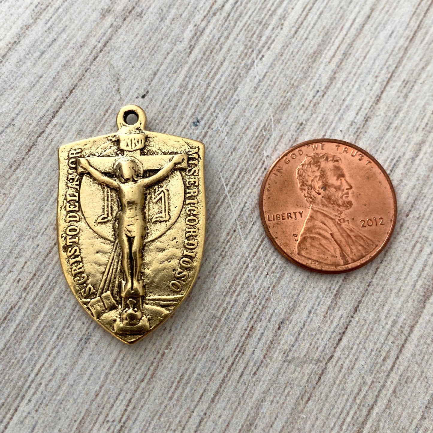 This is a beautiful crucifix in the shape of a shield. The other side depicts the Blessed Mother. The modern lines make this a great crucifix for men as well as women.
